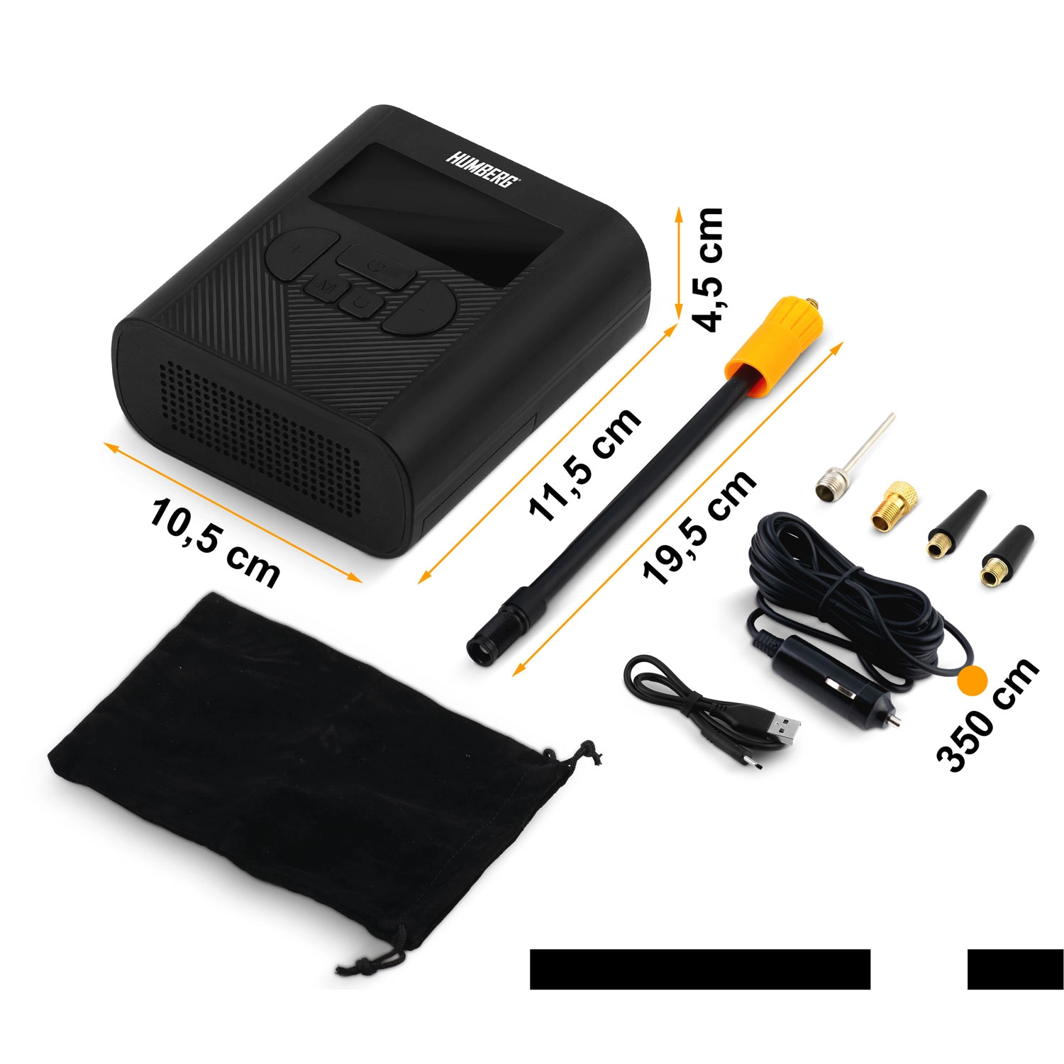 De HUMBERG mini-compressor bundelt hoge prestaties in een zakformaat. Stel eenvoudig de gewenste druk in, kies de modus en de compressor stopt automatisch zodra de waarde is bereikt. Draadloze werking, een robuuste constructie en een overzichtelijk display maken hem tot een betrouwbare partner voor auto, garage en reizen.