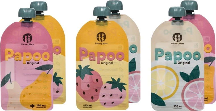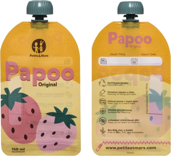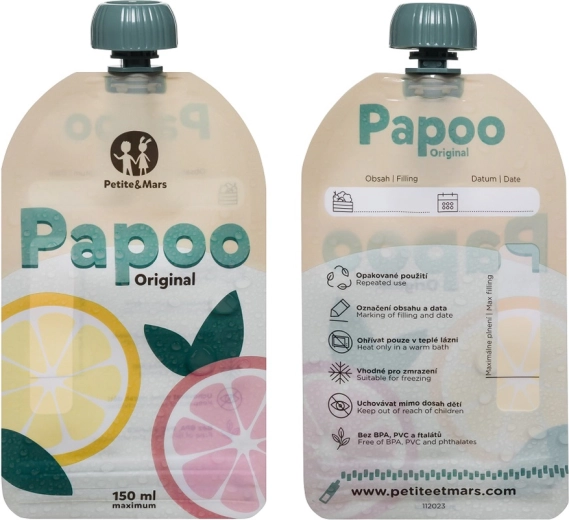 Praktische en milieuvriendelijke PETITE&MARS Papoo Original zakjes met een inhoud van 150 ml zijn ideaal voor tussendoortjes, puree en yoghurt voor onderweg. Ze zijn herbruikbaar, vaatwasmachinebestendig, vriesbestendig en gemakkelijk te labelen. Vrij van schadelijke stoffen BPA, PVC en ftalaten en ontworpen zodat kinderen zichzelf comfortabel en zonder knoeien kunnen voeden.
