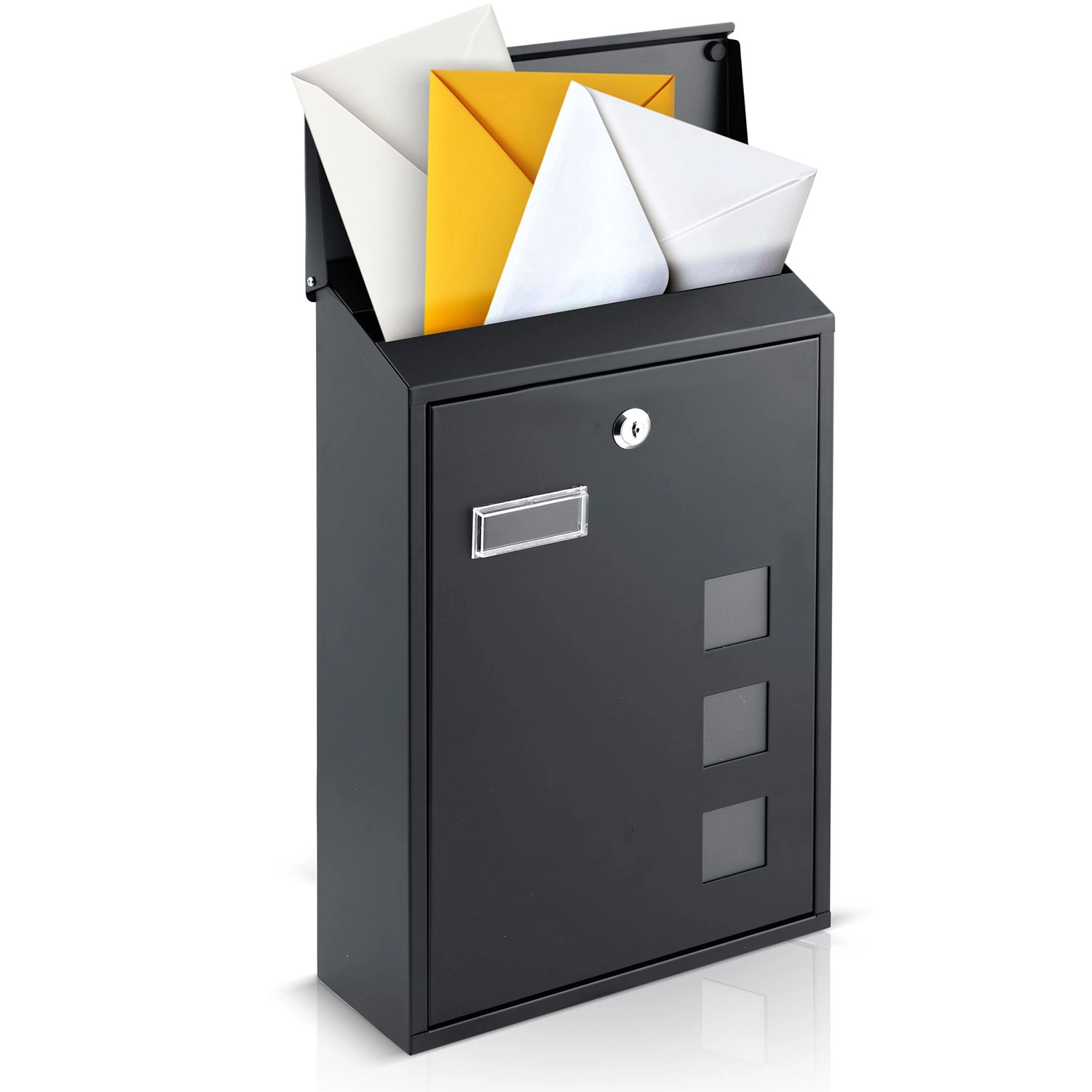 De gedempte klep van de boveninworp sluit stil en soepel. Het slot met twee sleutels beschermt uw post tegen nieuwsgierige blikken en onbevoegde toegang.