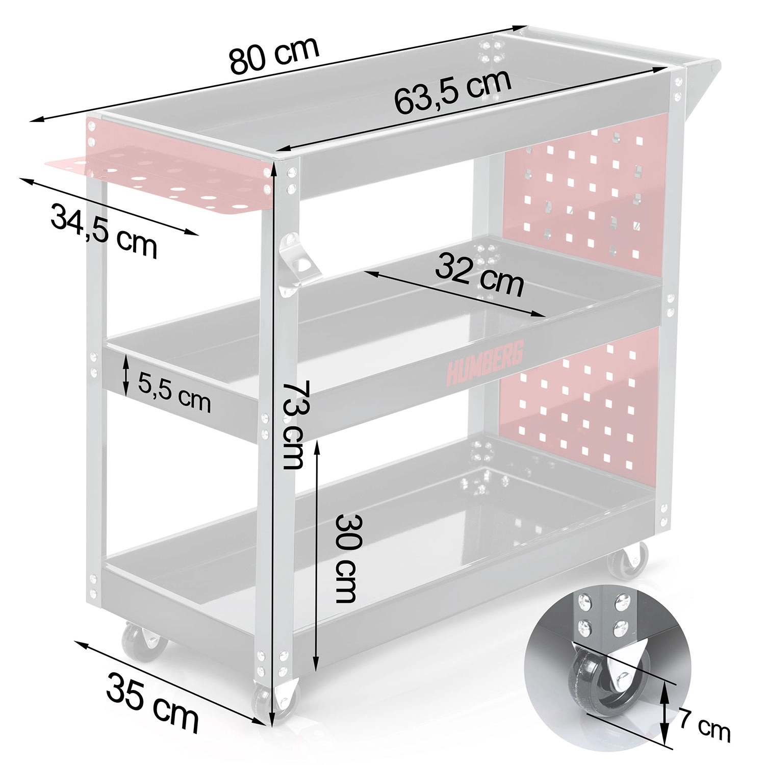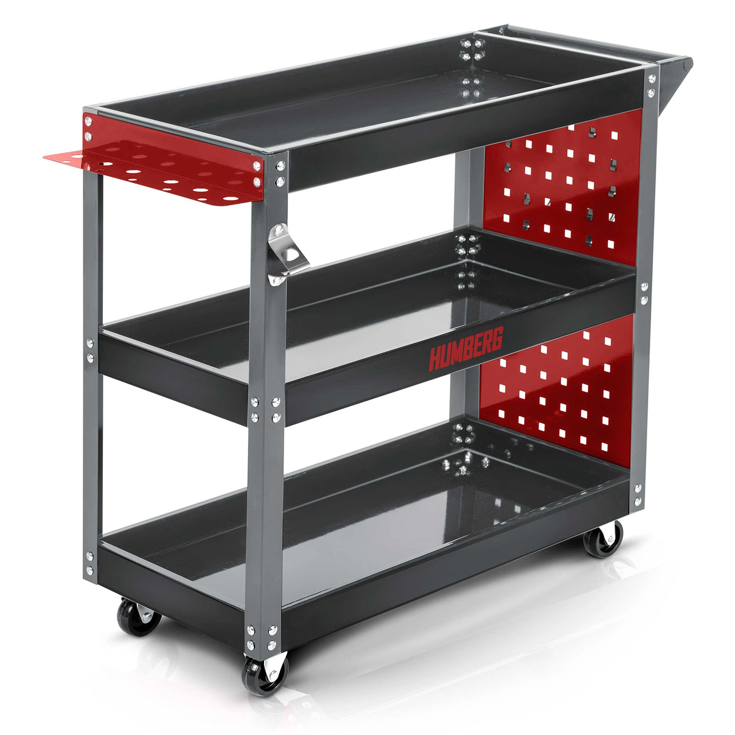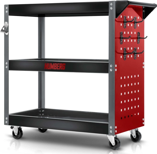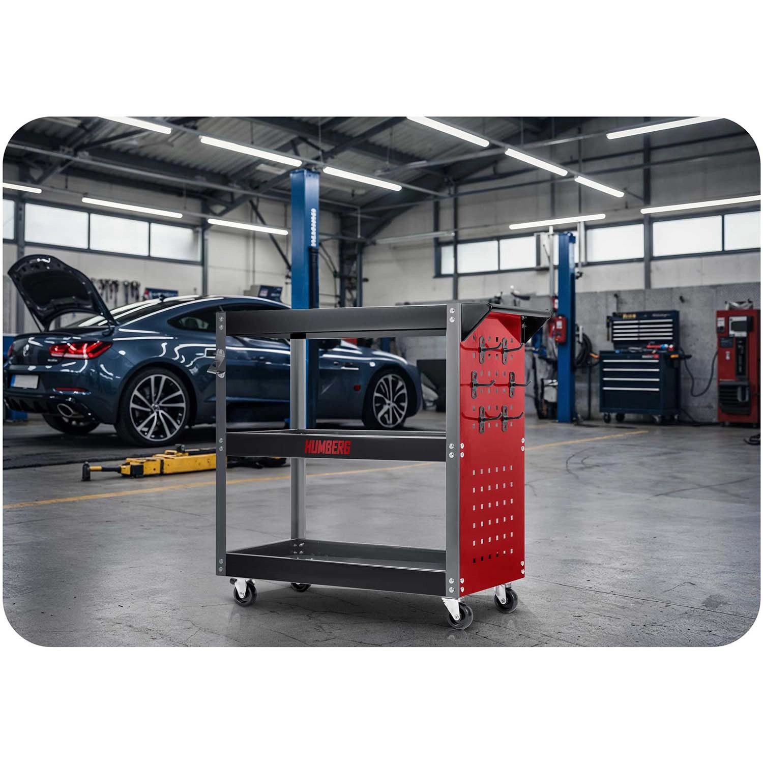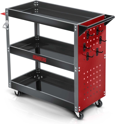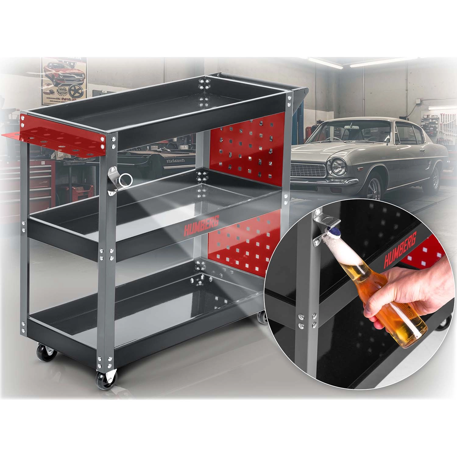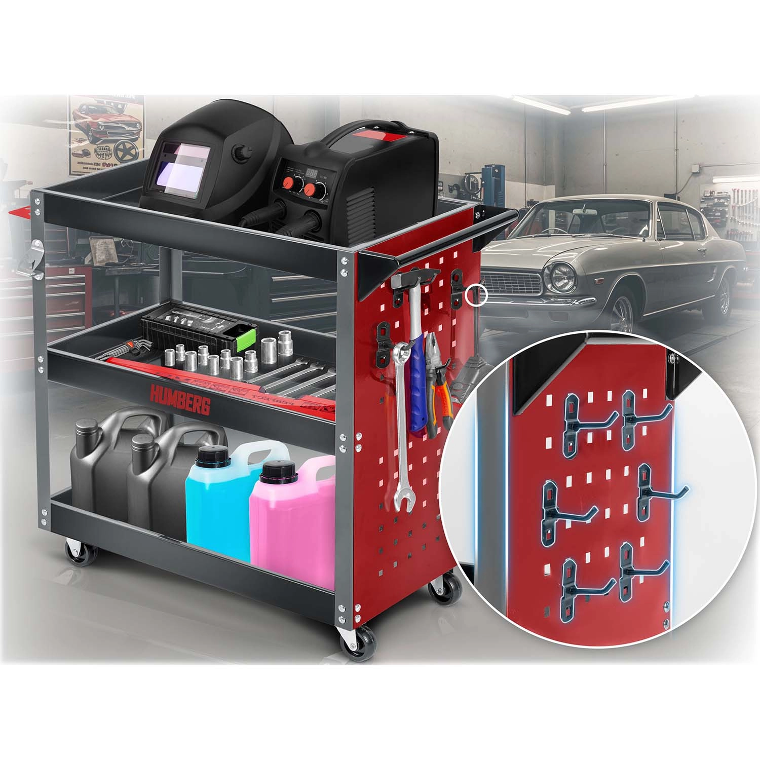 De HUMBERG wagen is ontworpen voor veeleisende werkplaatsomgevingen. Hij combineert roestvrij staal en aluminium voor hoge duurzaamheid en een lange levensduur. Drie diepe leggers bieden voldoende ruimte voor gereedschap, onderdelen en accessoires, terwijl geperforeerde zijpanelen met haken vaak gebruikte tools altijd binnen handbereik houden.
