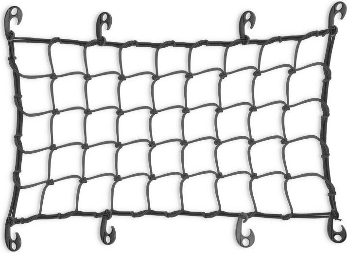Inclusief een duurzaam en flexibel net met 8 haken dat de lading stevig op zijn plaats houdt, ook bij hobbelige ritten.