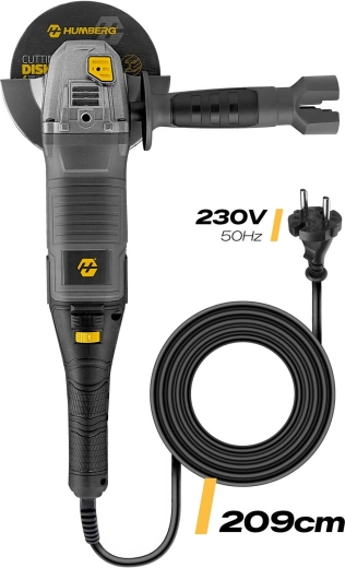 Krachtige HUMBERG haakse slijper met 1200 W motor, traploze toerentalregeling 3000–12000 t/min en M14 schroefdraad. Ideaal voor snijden en slijpen van metaal, beton, steen en keramiek. In de set zitten 10 schijven van 125 mm, een zijhandgreep met 3 posities, een metalen schijfkap en accessoires voor snelle wissel. De lange kabel van 209 cm en lage vibraties zorgen voor comfortabel en veilig werken, thuis en in de werkplaats.