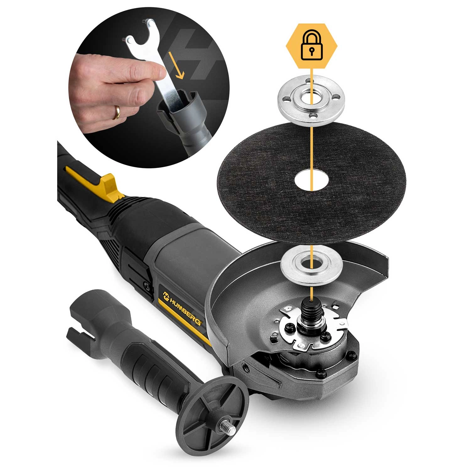 - Snel schijven wisselen: montagesleutel en twee metalen flenzen voor veilige klemming