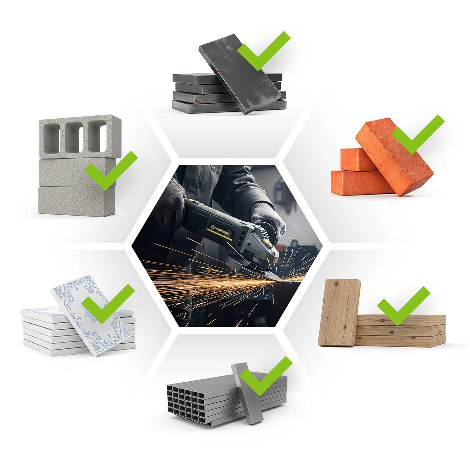 - Breed inzetbaar: metaal, beton, steen, keramiek, baksteen, kunststoffen, hout (met geschikte schijf)