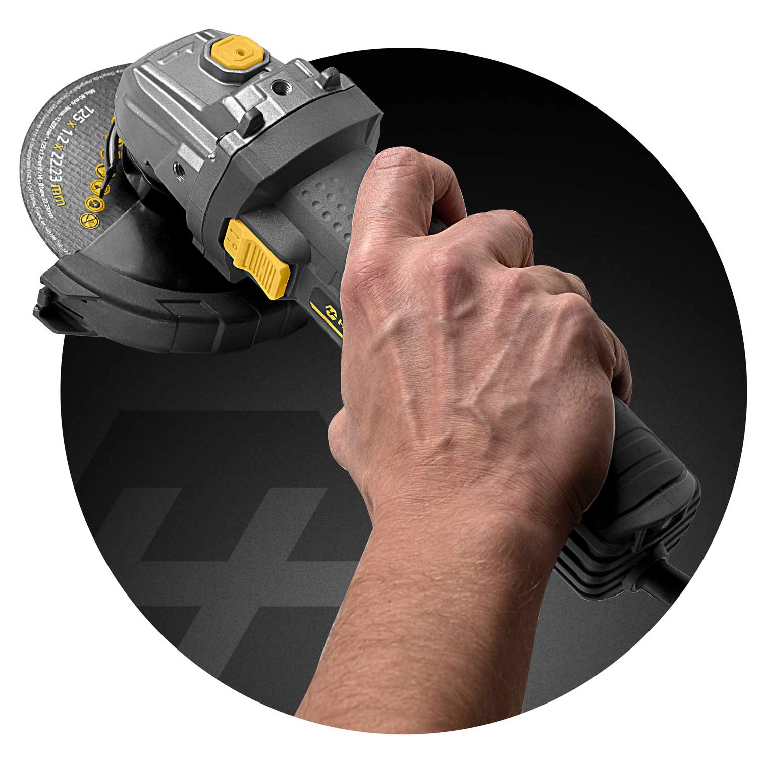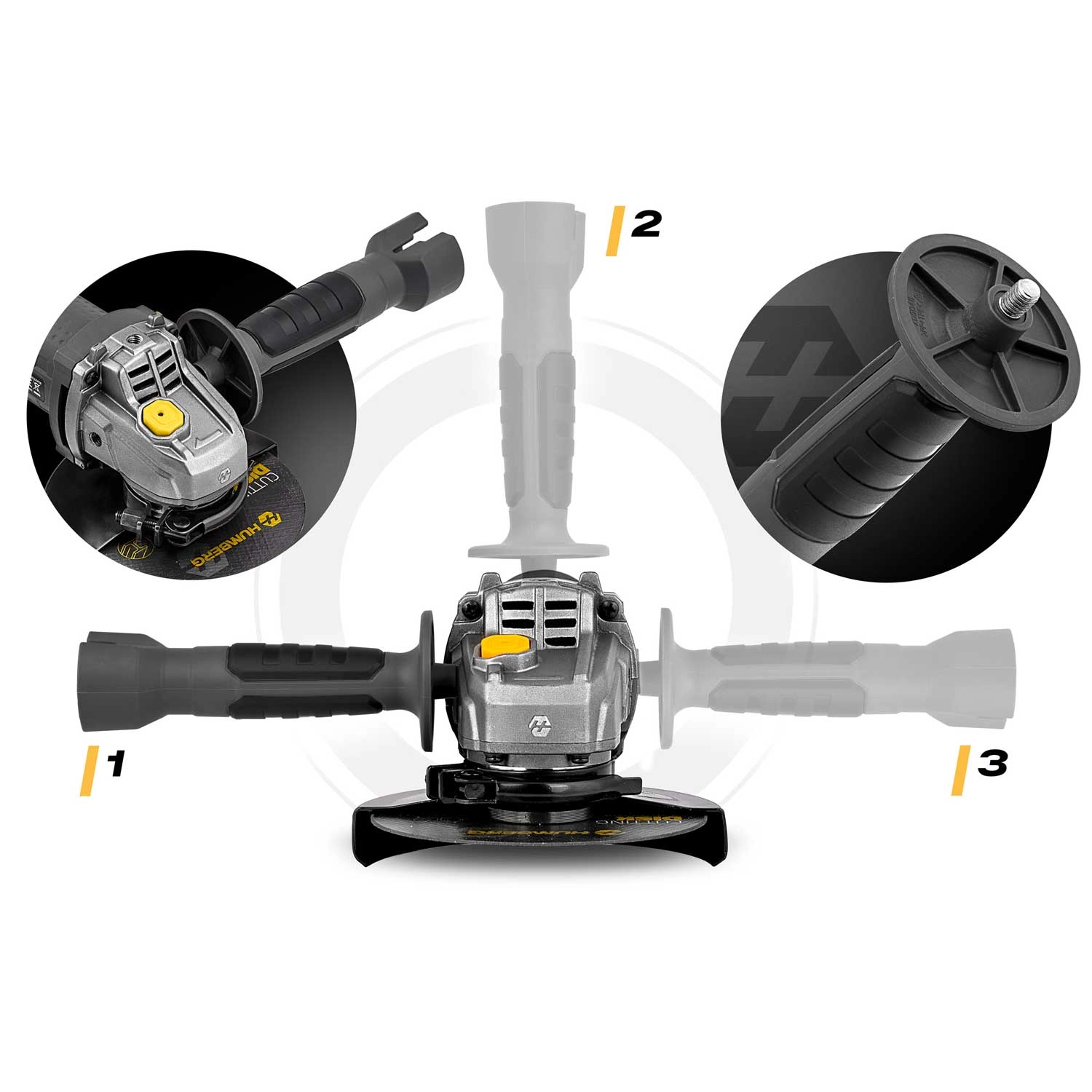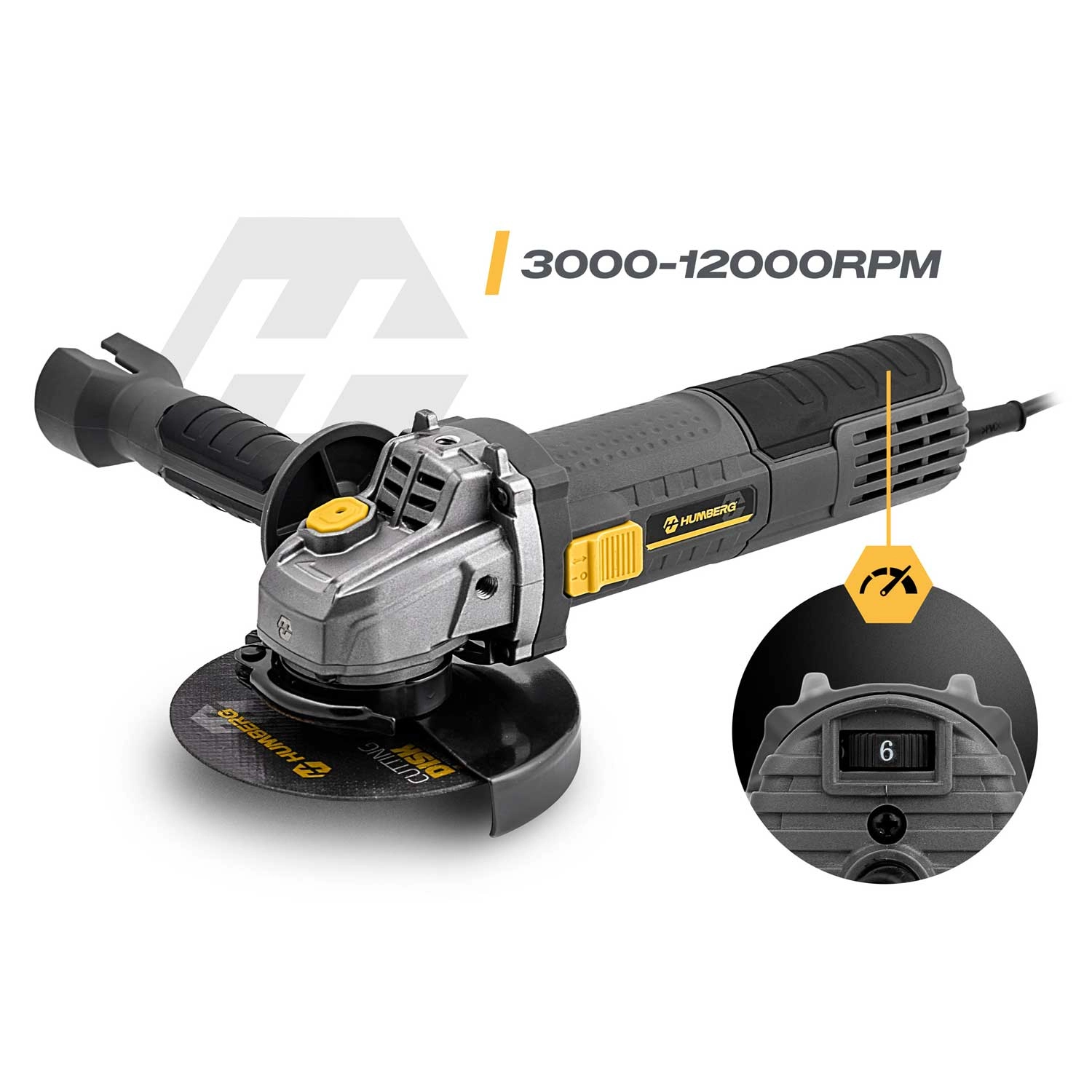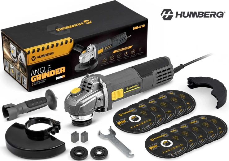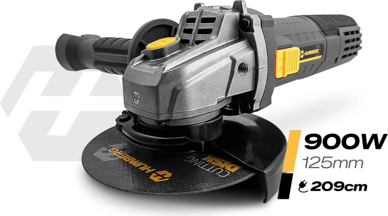Compacte en krachtige HUMBERG 900 W haakse slijper met traploze toerentalregeling 3000–12000 t/min, M14-schroefdraad en een kabel van 209 cm. In de set zitten 10 schijven van 125 mm, een zijhandgreep en een beschermkap voor veilig en precies werken bij het snijden en slijpen van metaal, beton en keramiek.
