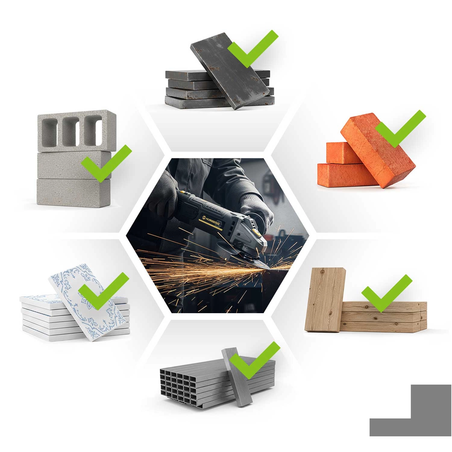 - Breed inzetbaar: snijden en slijpen van metaal, beton, steen, keramiek, baksteen en kunststoffen.