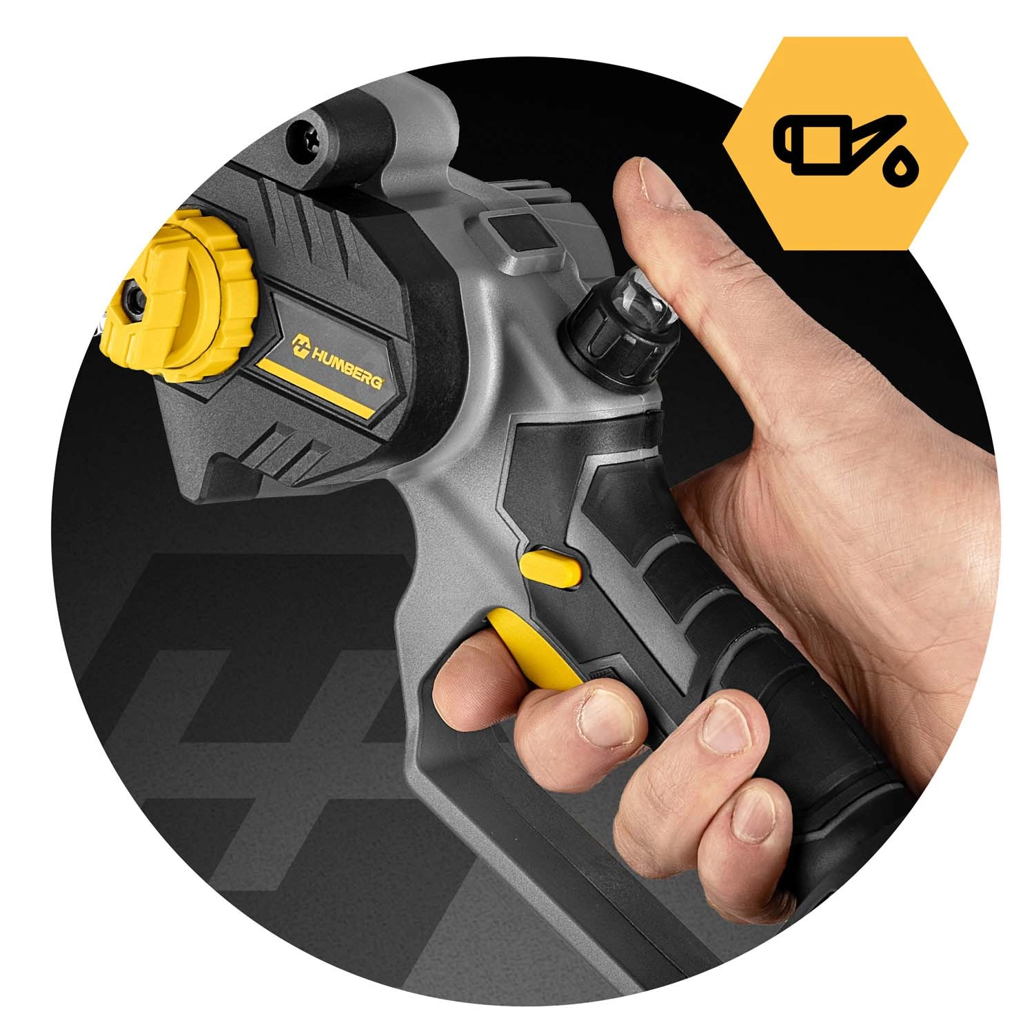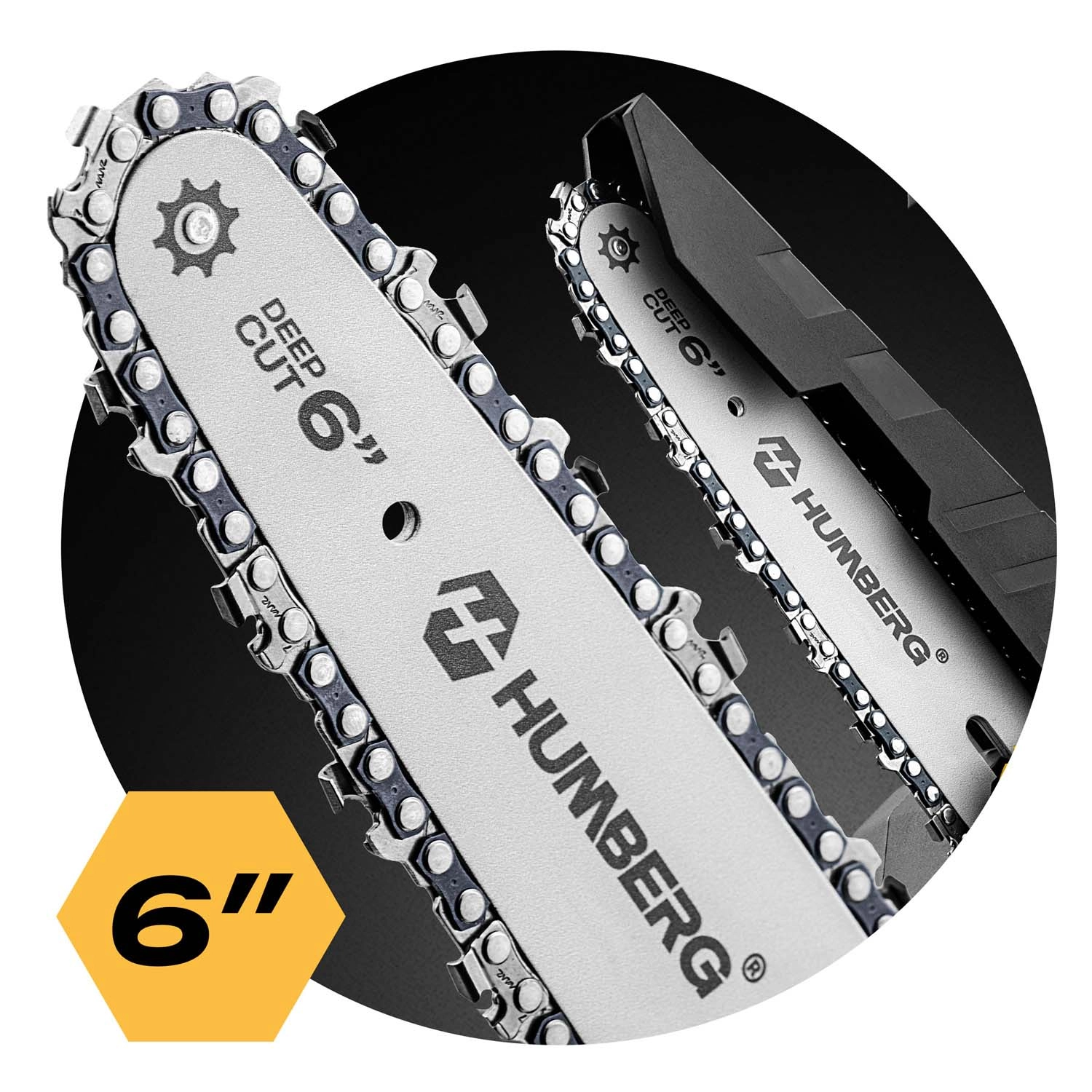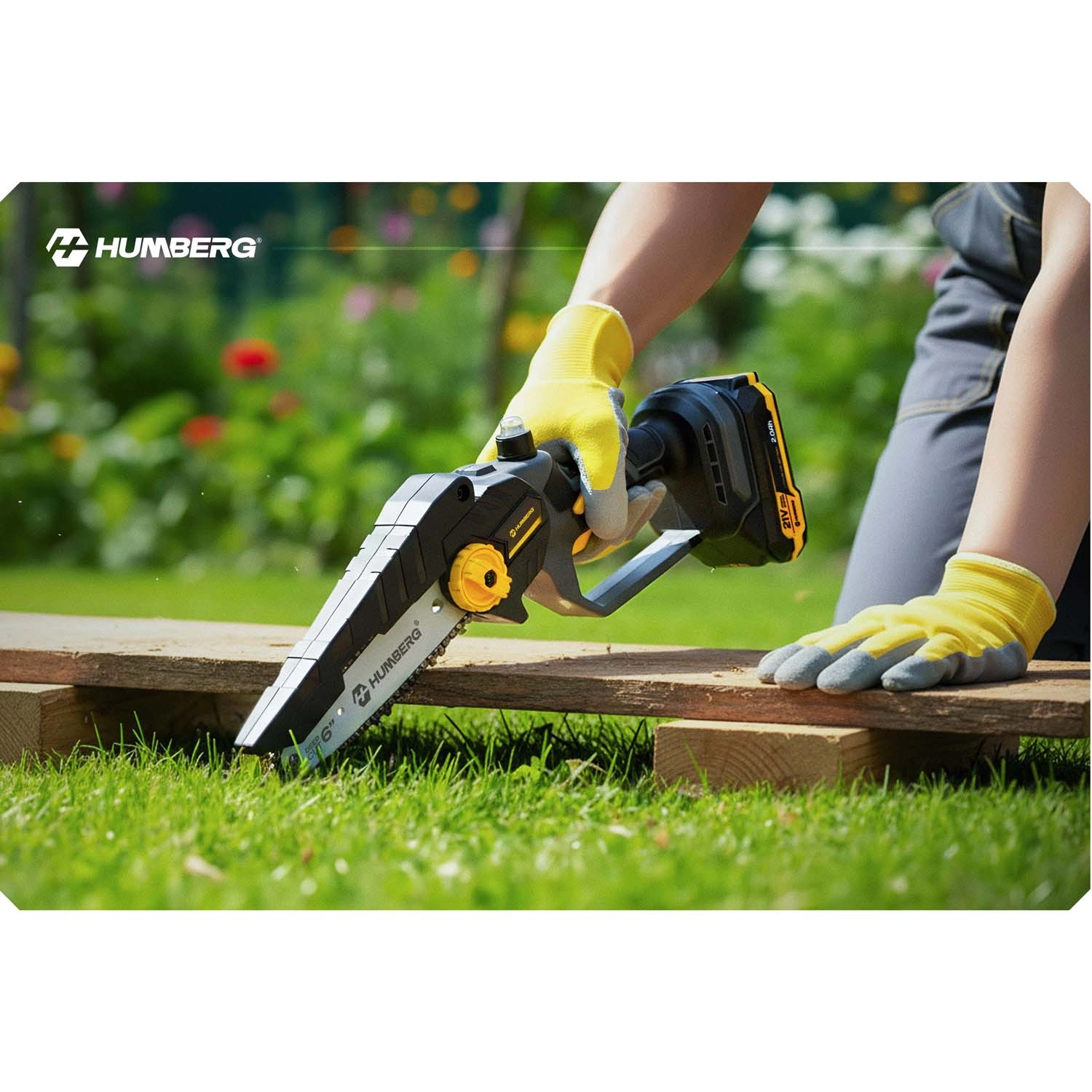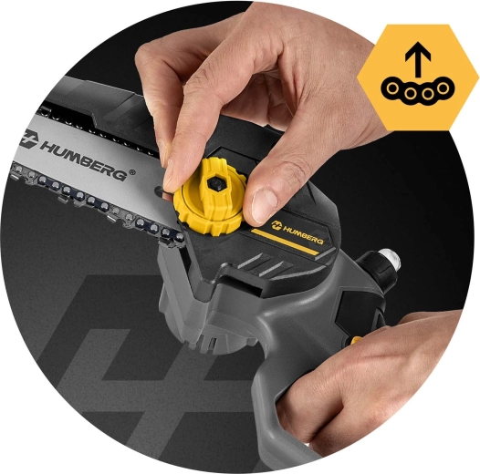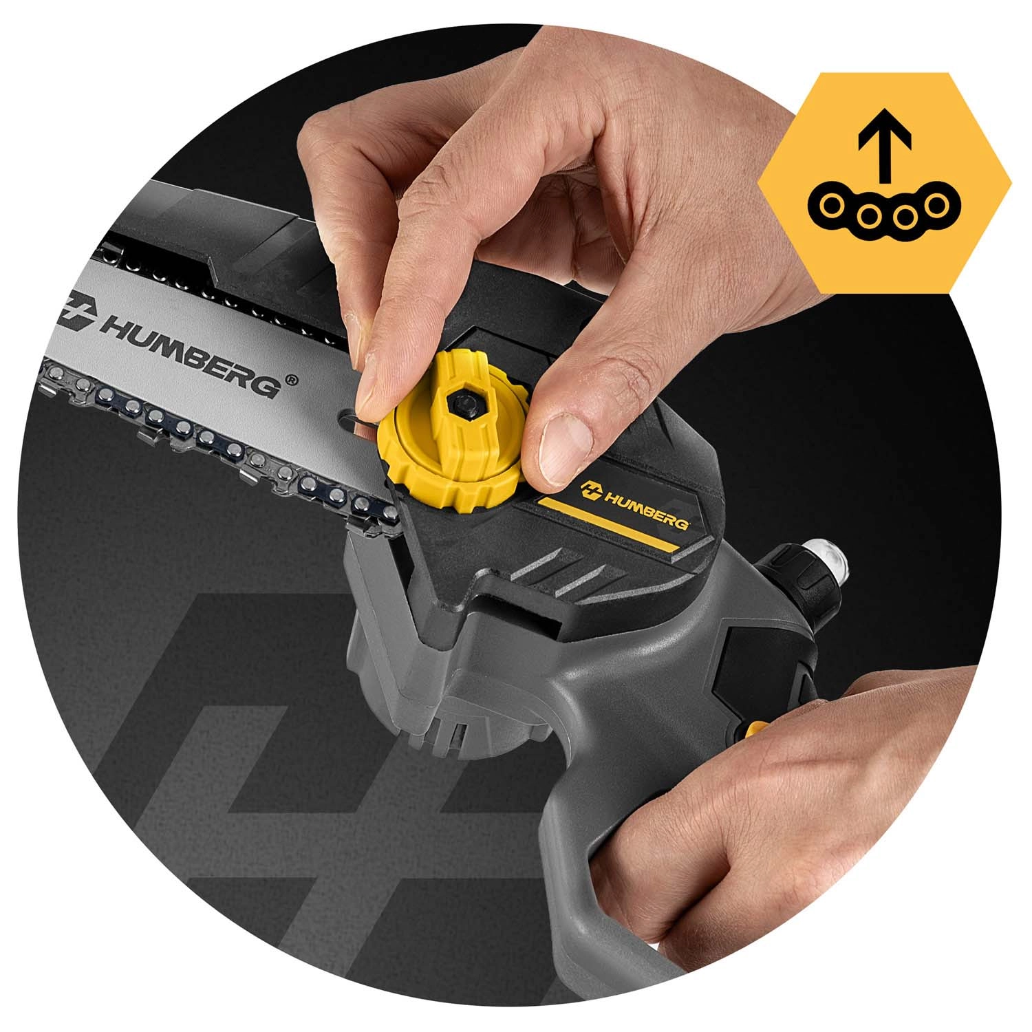 De Humberg accu mini-zaag combineert een borstelloze motor met tot 21.000 t/min voor stabiele prestaties zonder vastlopen. Dankzij automatische oliesmering en een kettingbeschermer zaag je snel en veilig. Gereedschapsloze kettingspanning via het zijwieltje verkort de voorbereiding – gewoon draaien en zagen.