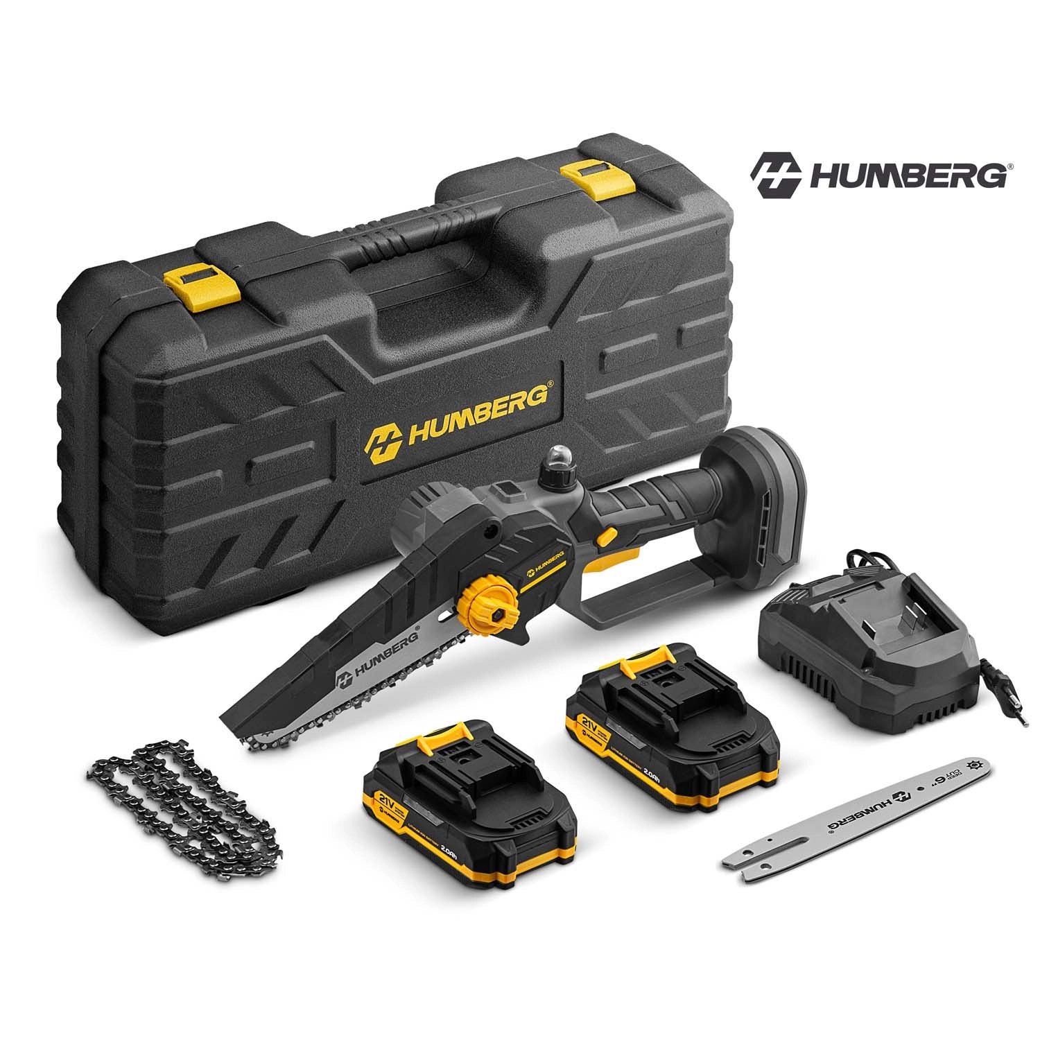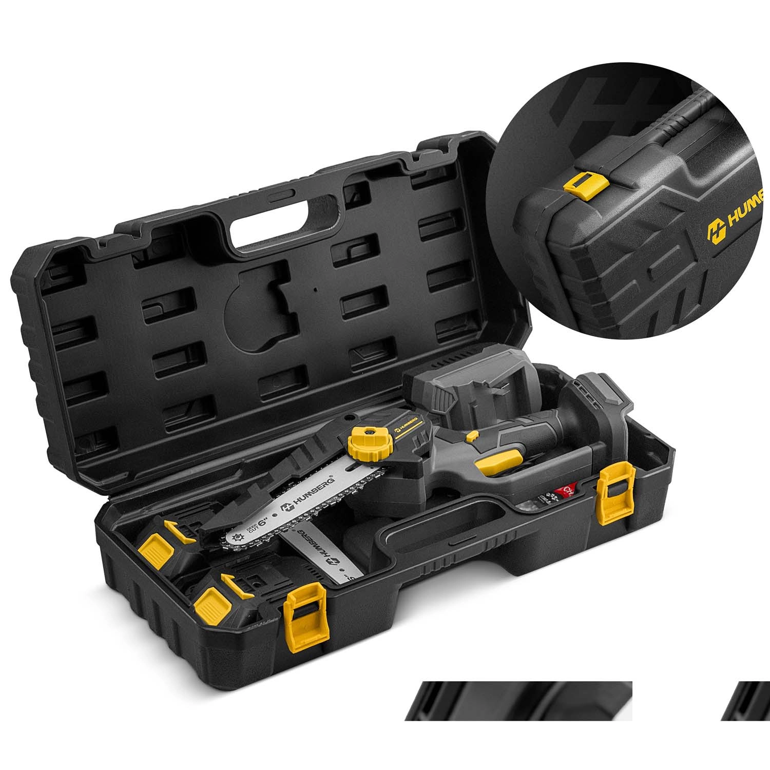 Compacte en krachtige accu mini-zaag van Humberg met een borstelloze motor biedt snel en soepel zagen tot 8,2 m/s, automatische kettingsmering en gereedschapsloze kettingspanning. In de set vind je 2× 21 V 2 Ah accu, 2× 6" geleider en 2× ketting – alles overzichtelijk opgeborgen in een stevige koffer voor gemakkelijk transport. Ideaal voor snoeien van takken, tuinwerk en lichte timmerklussen met maximaal comfort dankzij de ergonomische, rubberen handgreep en het lage gewicht van 1,4 kg.