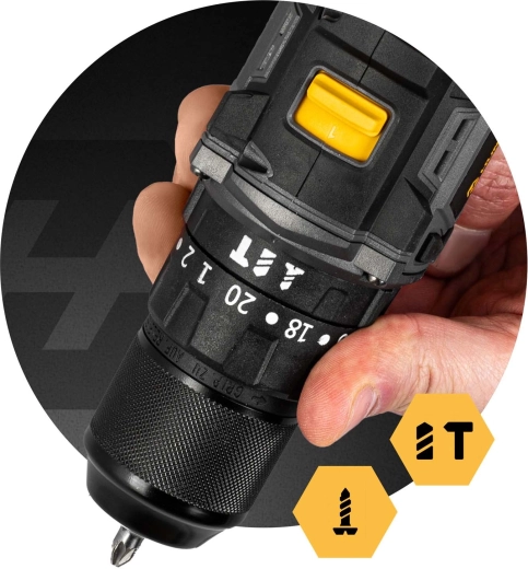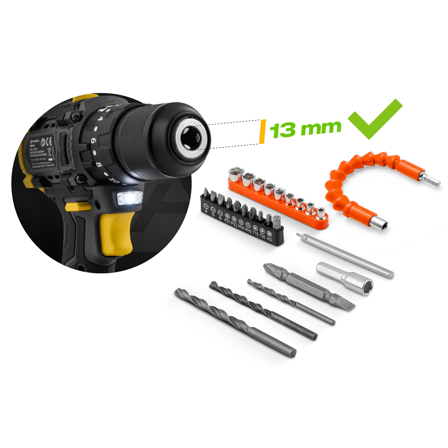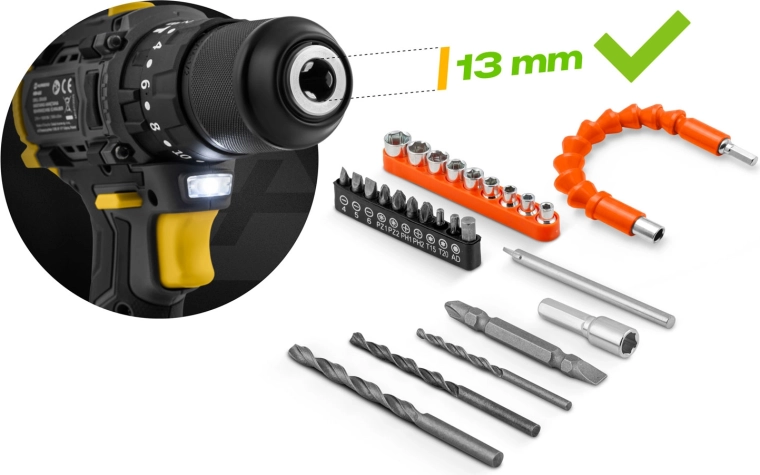 De ergonomische constructie met een zachte, antislipgreep biedt zekerheid en comfort, ook bij langer werken. De 20-traps koppeling beschermt materiaal en schroeven, twee snelheden laten u schakelen tussen nauwkeurig schroeven (0–400 t/min) en snel boren (0–1400 t/min). Het LED-licht verlicht de werkplek in donkere hoeken, kasten of plafonds.