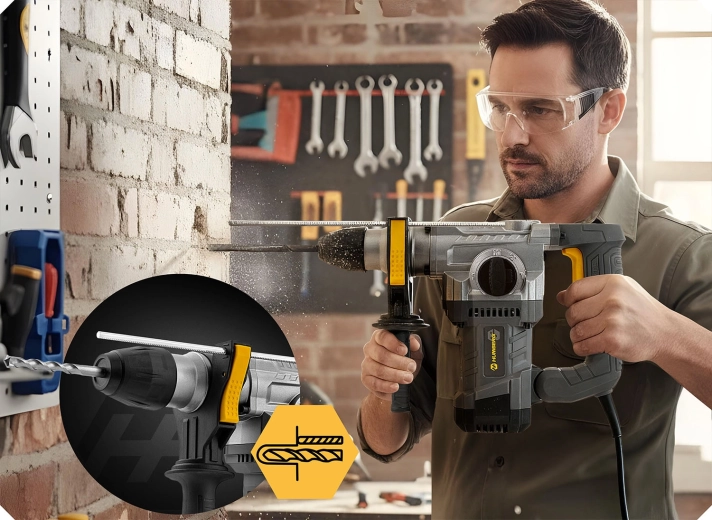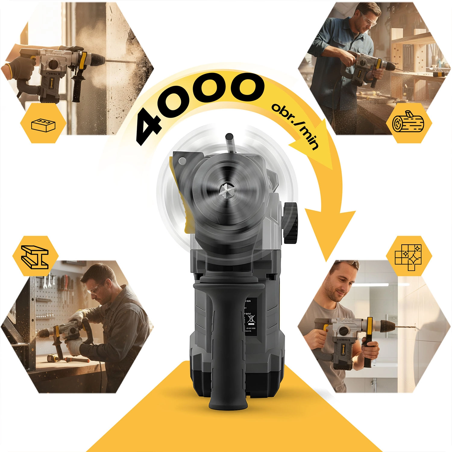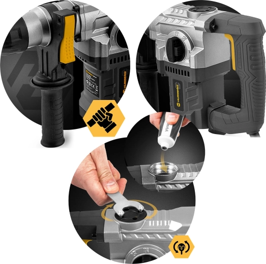 Kracht en precisie in één – duurzame koolborstelmotor met 1010 W vermogen en 4 J slagenergie biedt hoge efficiëntie bij hamerboren en beitelen. Toerentalregeling tot hoge waarden maakt aanpassing aan het materiaal mogelijk, smering van de tandwielkast verlengt de levensduur en de zachte, antivibrerende greep verhoogt het comfort, ook bij langer gebruik.
