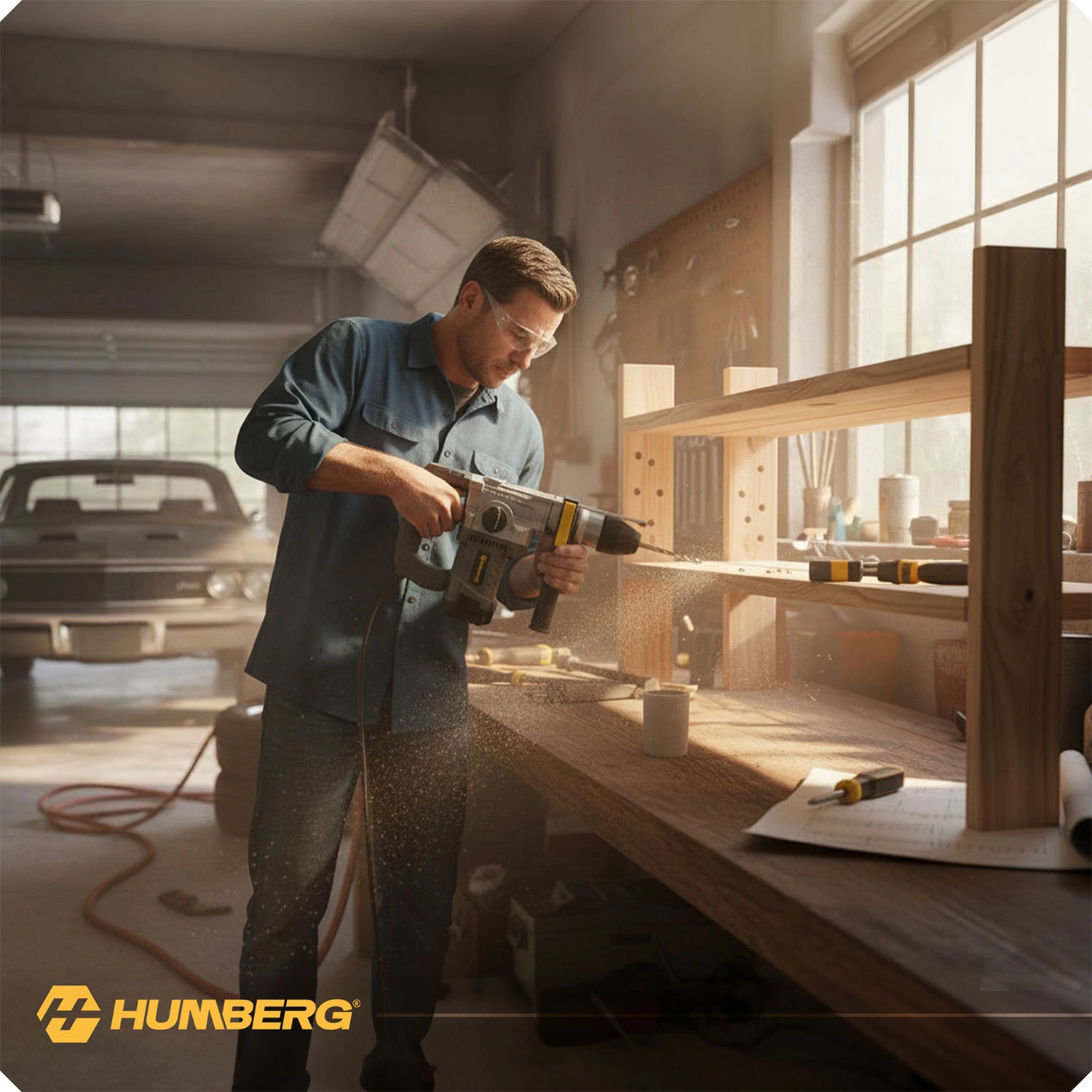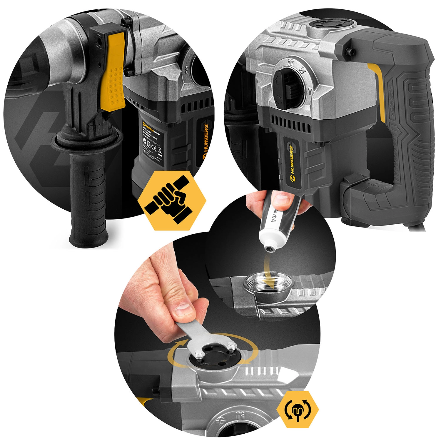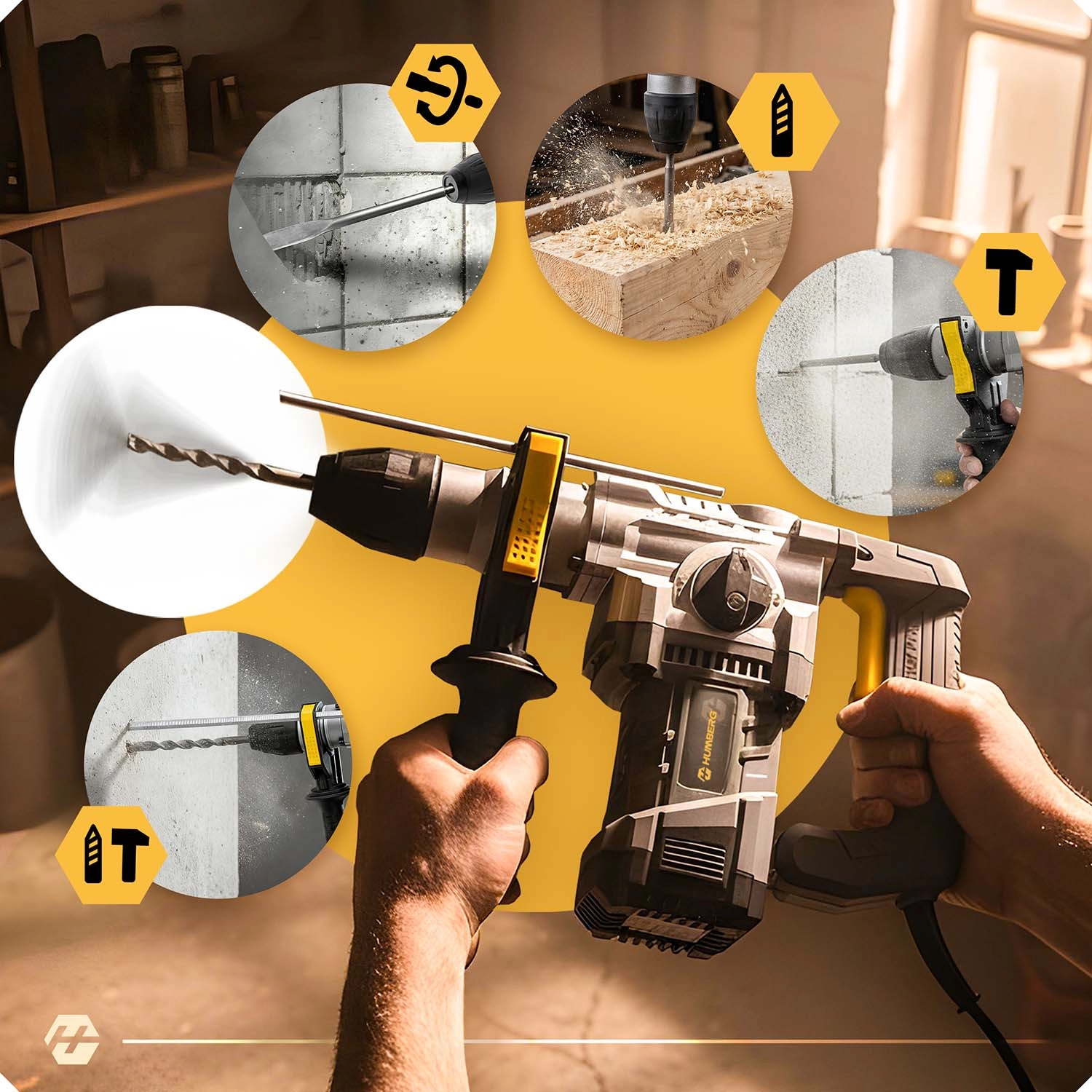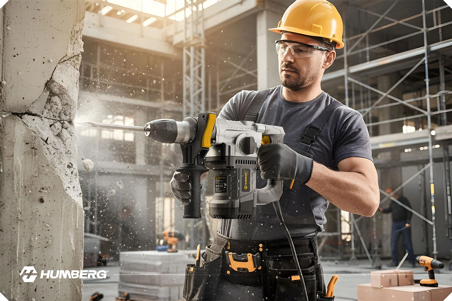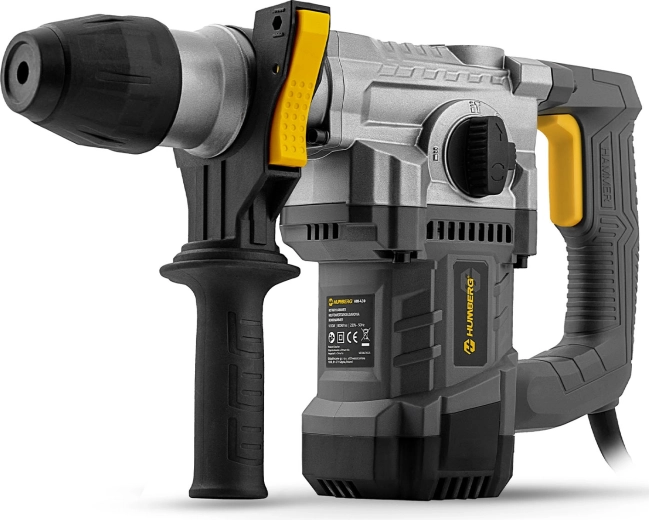 Krachtige slagboorhamer HUMBERG met 1010 W motor en 4 J slagenergie voor boren en beitelen in beton, metselwerk, hout en metaal. Snel wisselen van gereedschap dankzij SDS Plus-opname, 4 werkstanden en toerentalregeling voor maximale controle. Inclusief rijke uitrusting in een robuuste koffer en een 2 m netsnoer voor comfortabel werken.