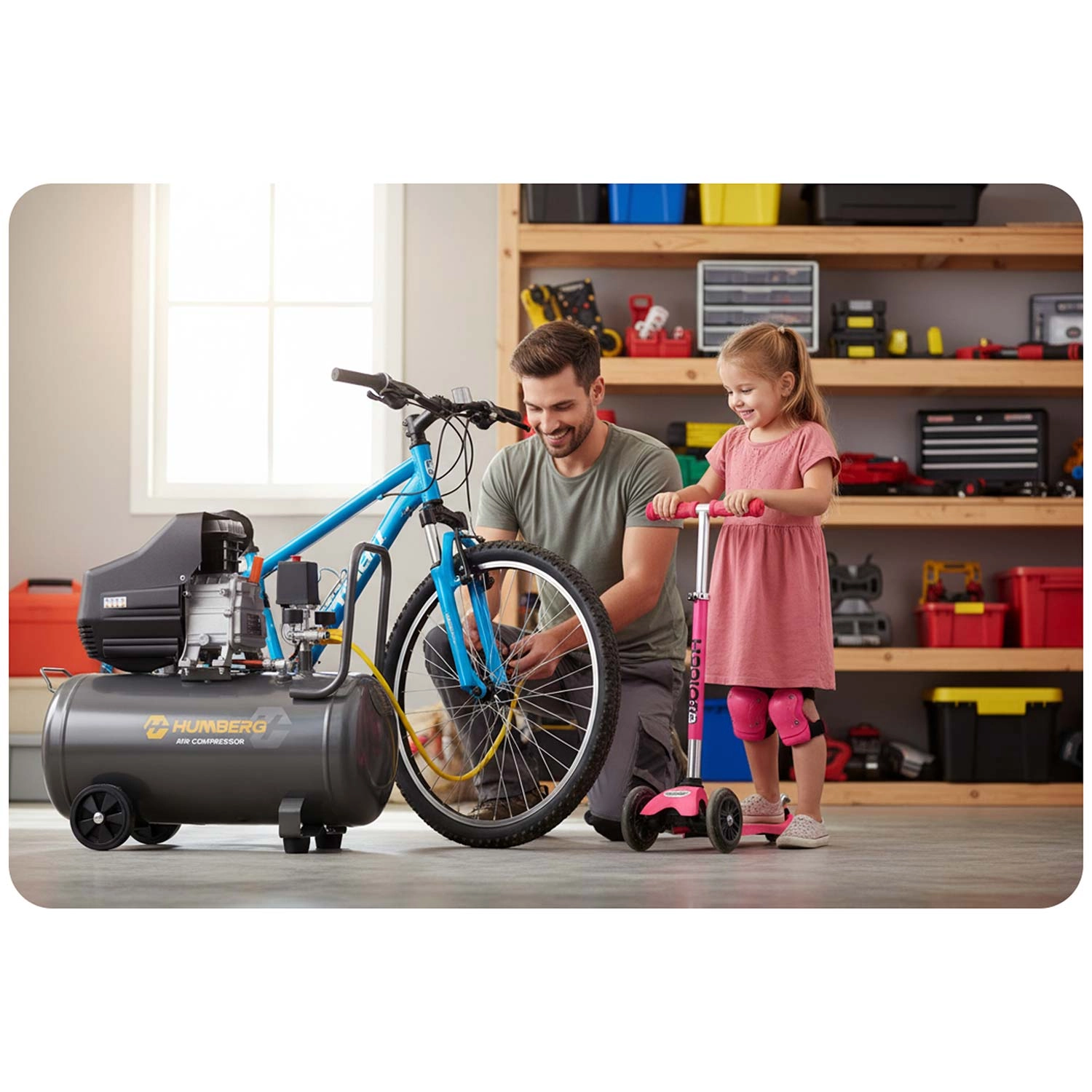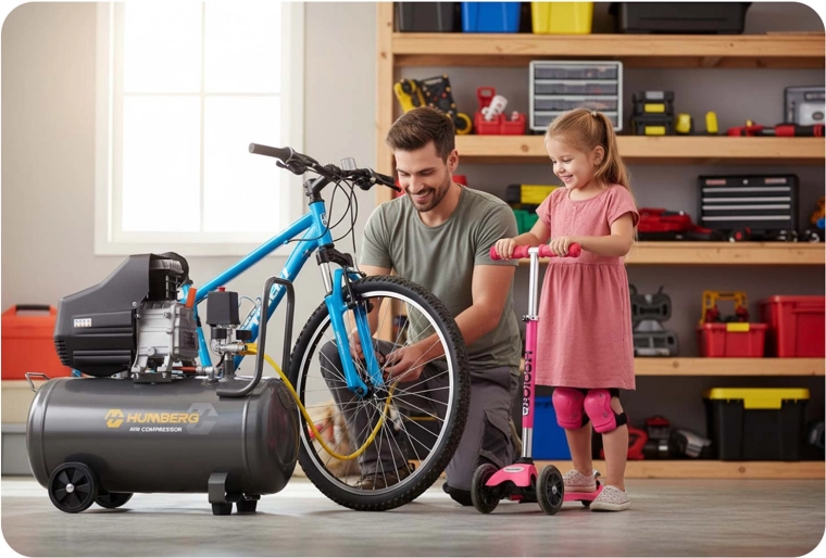 - Set koppelingen en adapters voor Schrader-, Presta/Dunlop- en autoventielen, ballen (3x naald), matrassen en grote ventielen (kruiwagens, karren).