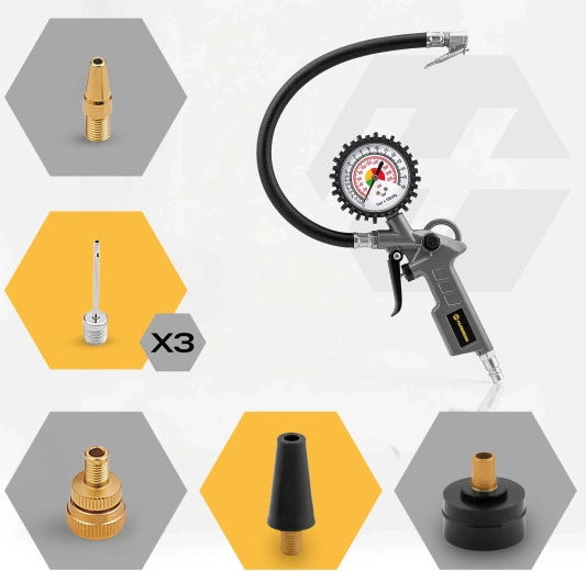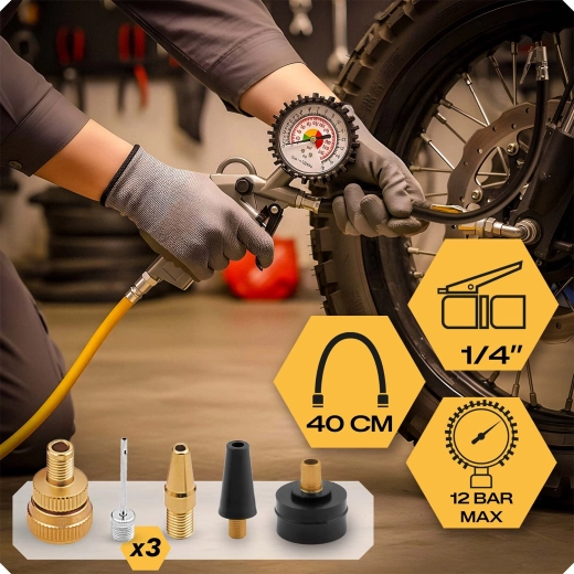 Vulpistool met ingebouwde analoge manometer, 40 cm flexibele slang en standaard 1/4"-aansluiting voor veilig en precies oppompen van fiets- en autobanden. Inclusief meerdere adapters voor universeel gebruik.