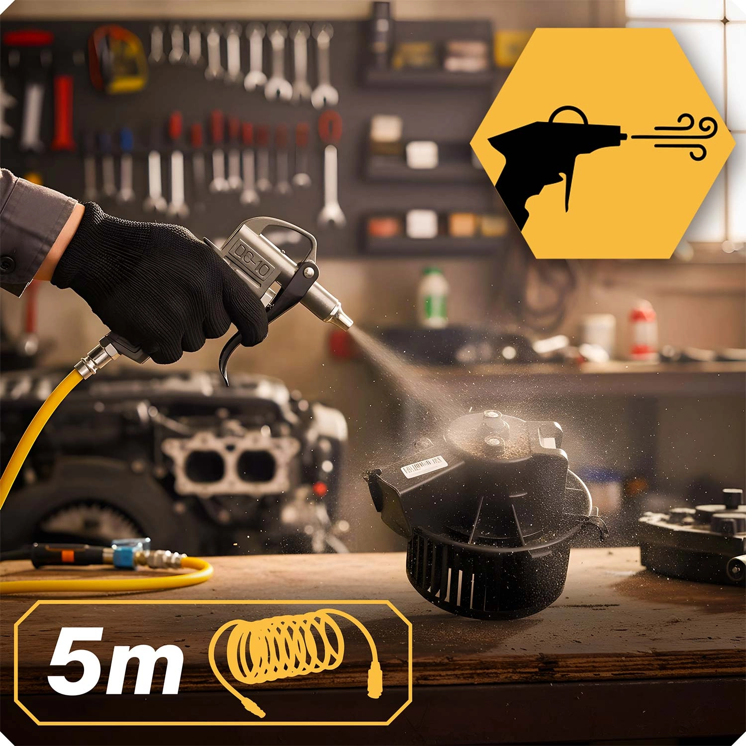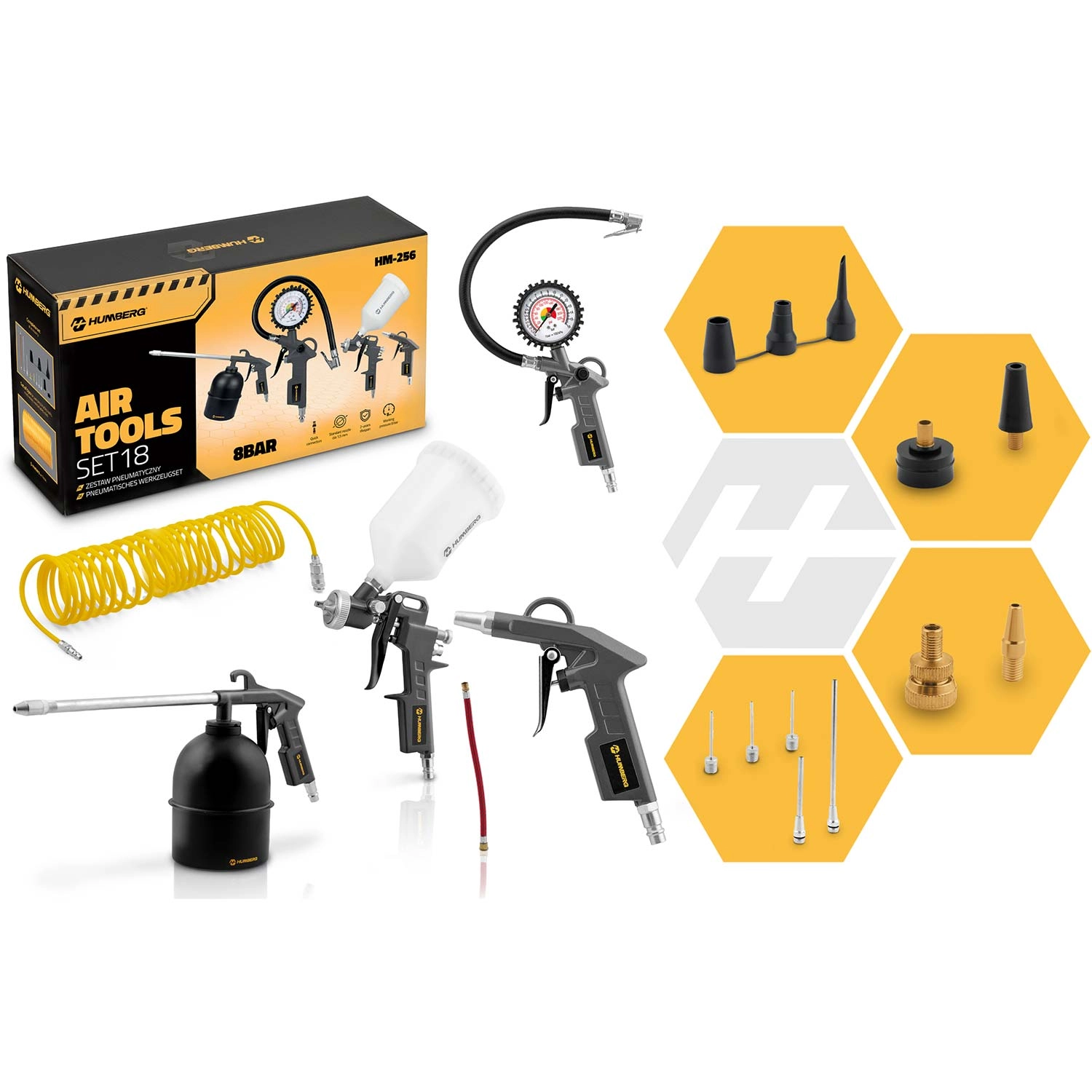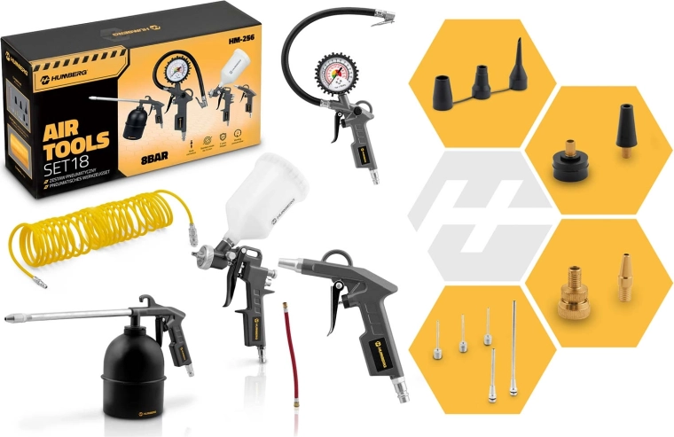 Universele 18-in-1 pneumatische gereedschapsset voor werkplaats en garage waarmee u alles aankunt: van nauwkeurig banden oppompen en grondig reinigen met perslucht tot spuitwerk en het aanbrengen van beschermlagen. Dankzij de standaard 1/4"-snelkoppelingen past hij op de meeste compressoren en levert hij snelle, comfortabele en professionele resultaten.