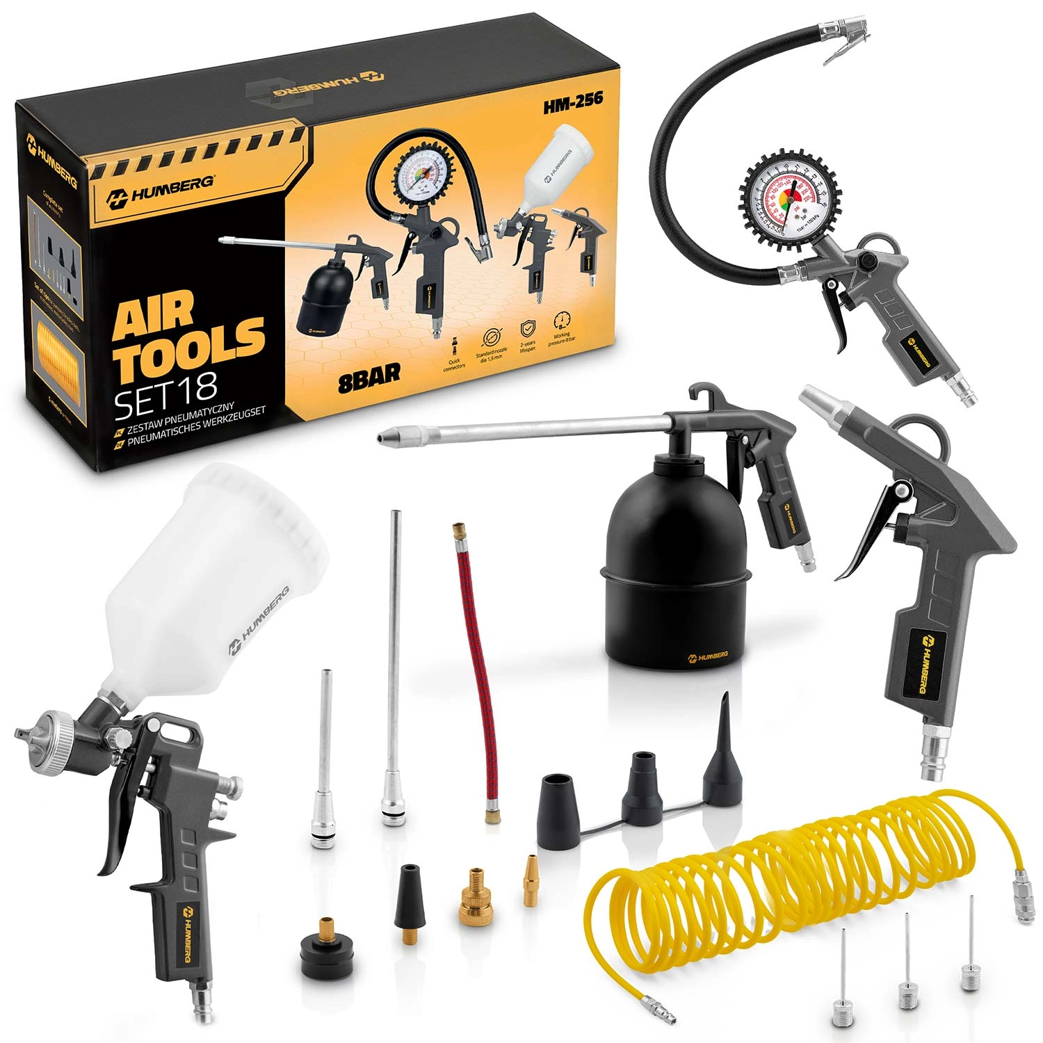 Complete pneumatische gereedschapsset met 18 onderdelen voor gebruik met een compressor – banden oppompen, afblazen en reinigen, spuiten en aanbrengen van conserveringsmiddelen. Bevat een vulpistool met manometer, blaaspistool, spuitpistool 600 ml, conserveringspistool 1 l, spiraalslang 5 m en een ruime selectie adapters en koppelingen voor wielen, ballen, matrassen en autoventielen.