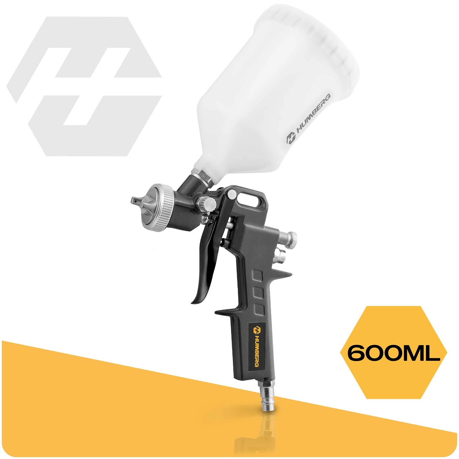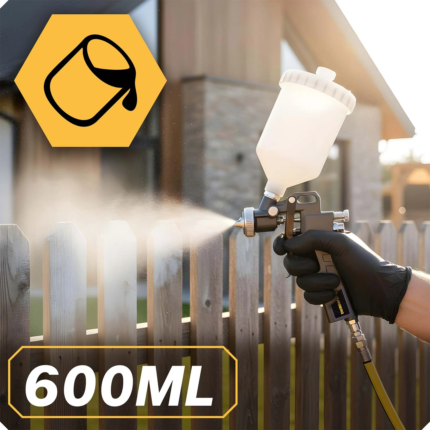 - Spuitpistool 600 ml met regeling van doorstroming en verneveling voor een egale applicatie zonder druipers.