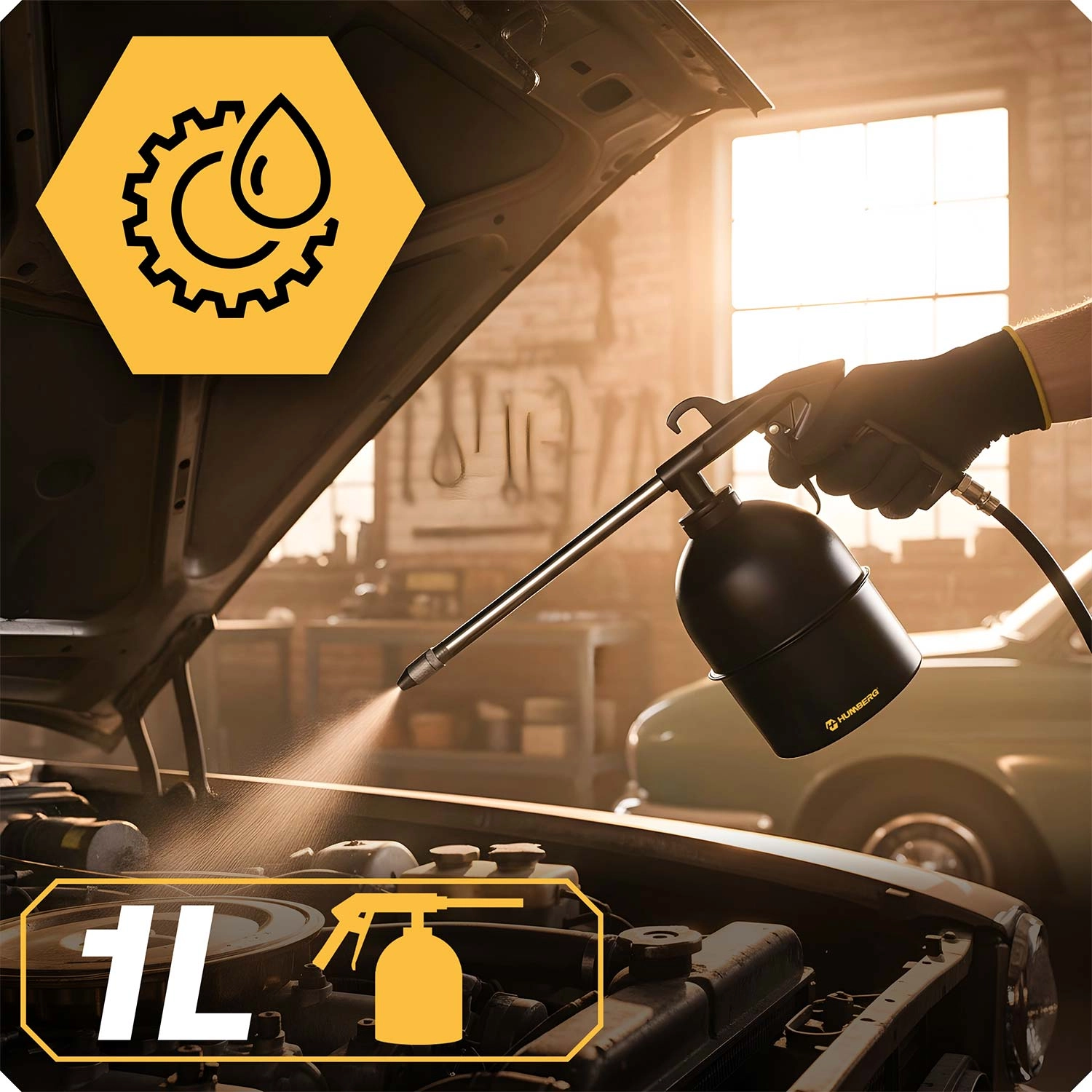- Conserveringspistool 1 l met verlengde nozzle voor het aanbrengen van meer viskeuze middelen (onderstellen, holle ruimten, machines).