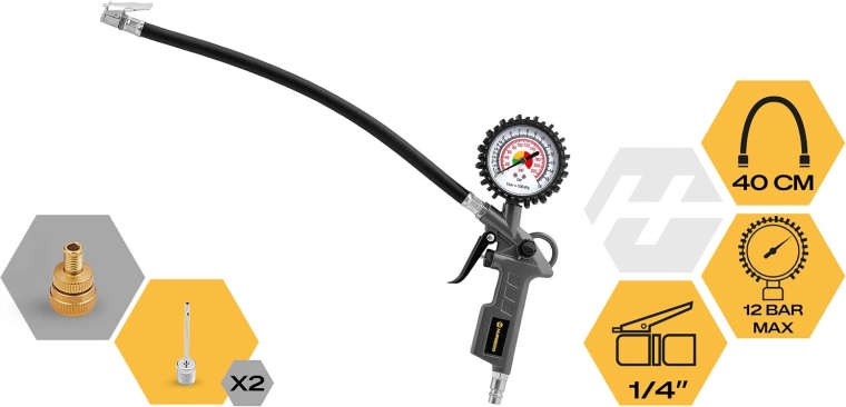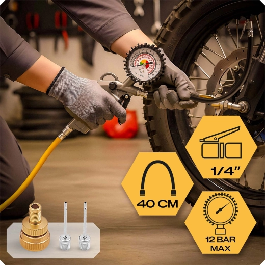 Deze rijk uitgeruste set levert professionele resultaten thuis en in de werkplaats. Het vulpistool met manometer maakt precieze drukcontrole mogelijk, de elastische slang van 40 cm vergemakkelijkt de toegang tot moeilijk bereikbare plaatsen en de standaard 1/4"-aansluiting garandeert compatibiliteit met de meeste compressoren. Meegeleverd zijn ook ventielen voor sportballen en een snelkoppeling voor snel en lekvrij aansluiten.
