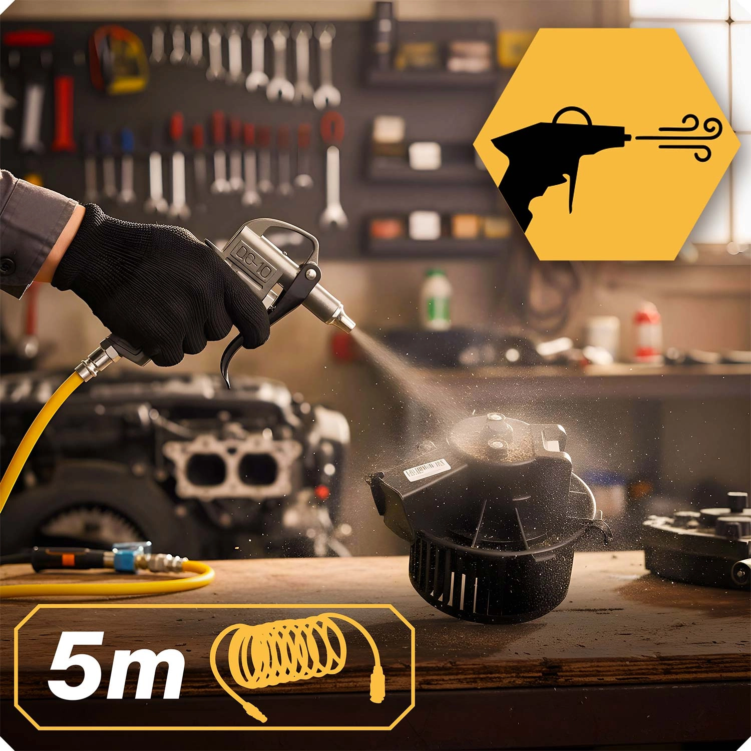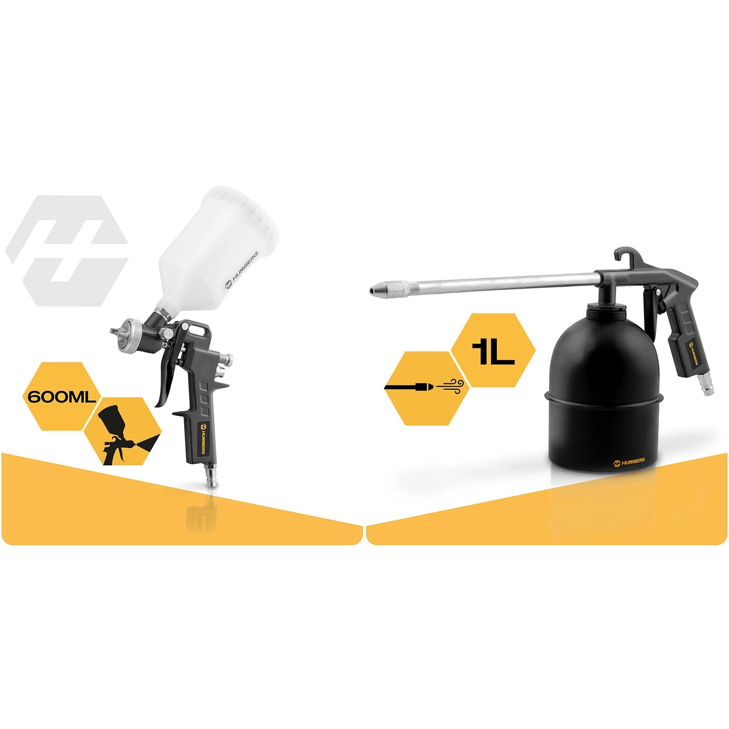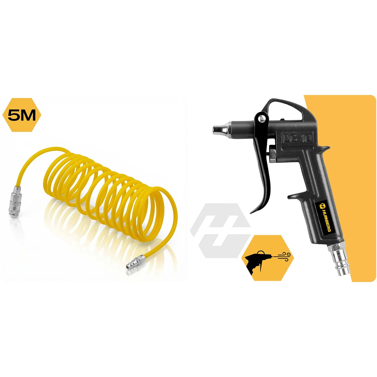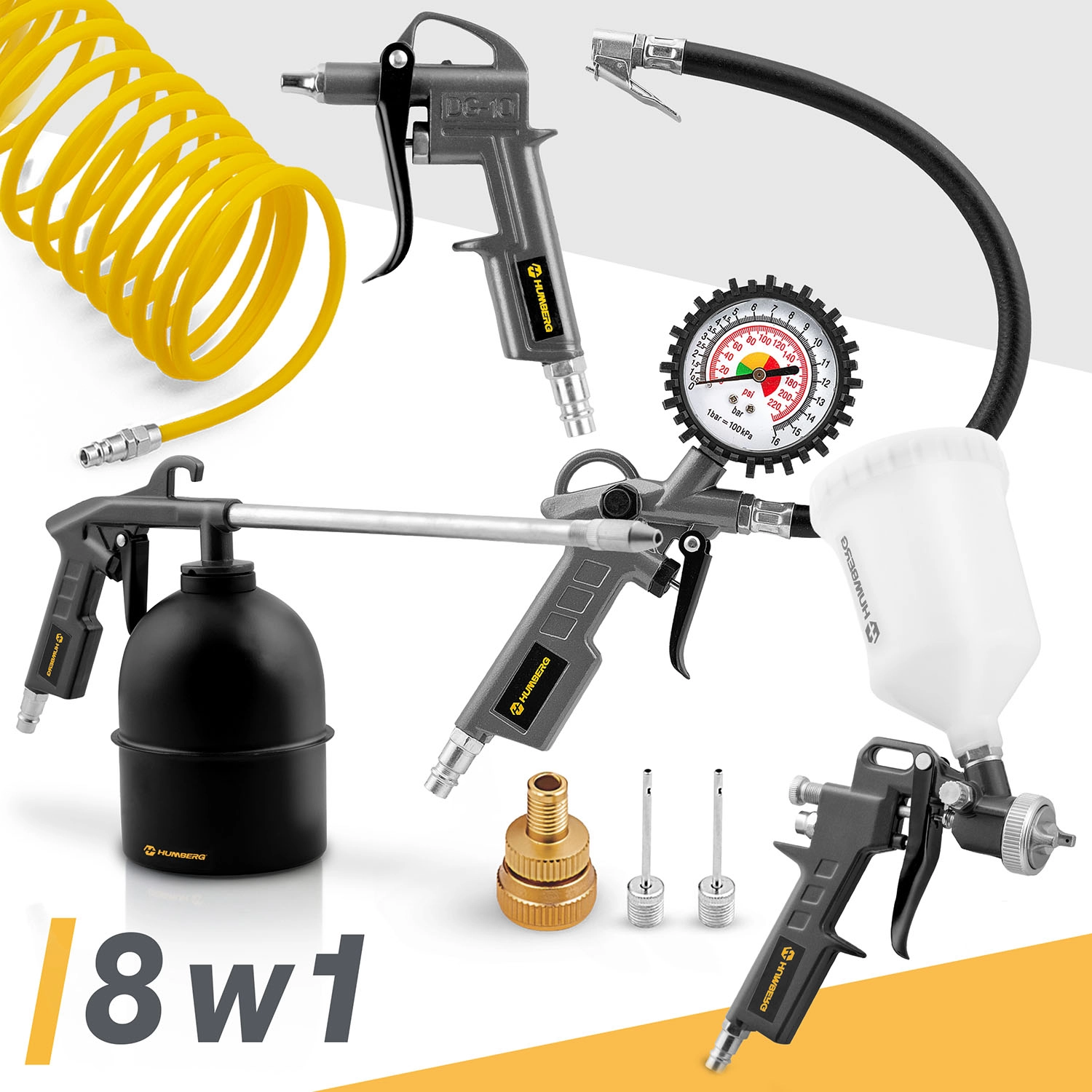 Universele 8-in-1 pneumatische gereedschapsset voor HUMBERG-compressoren voor banden oppompen, lakken, afblazen, reinigen en hogedrukreiniging. Bevat een vulpistool met manometer, een verfspuit- en conserveerpistool, een blaaspistool, een spiraalslang van 5 m, een snelkoppeling en opzetstukken – alles voor snel en nauwkeurig werk in werkplaats en garage.