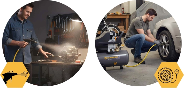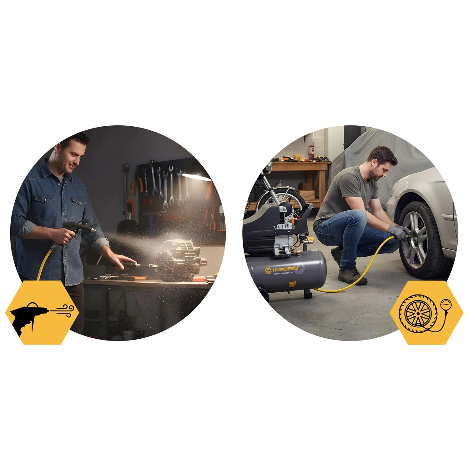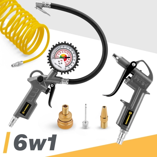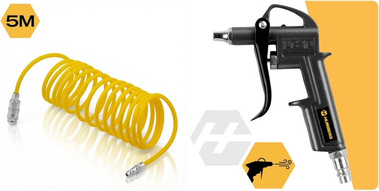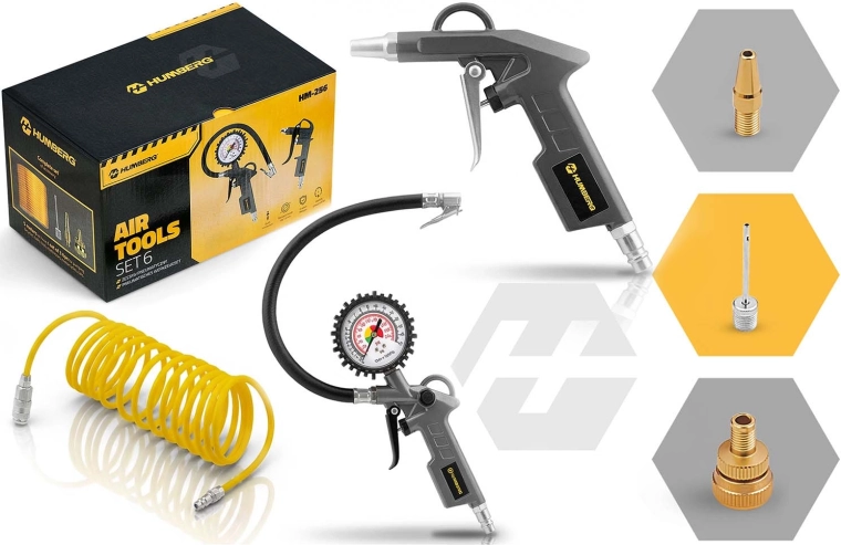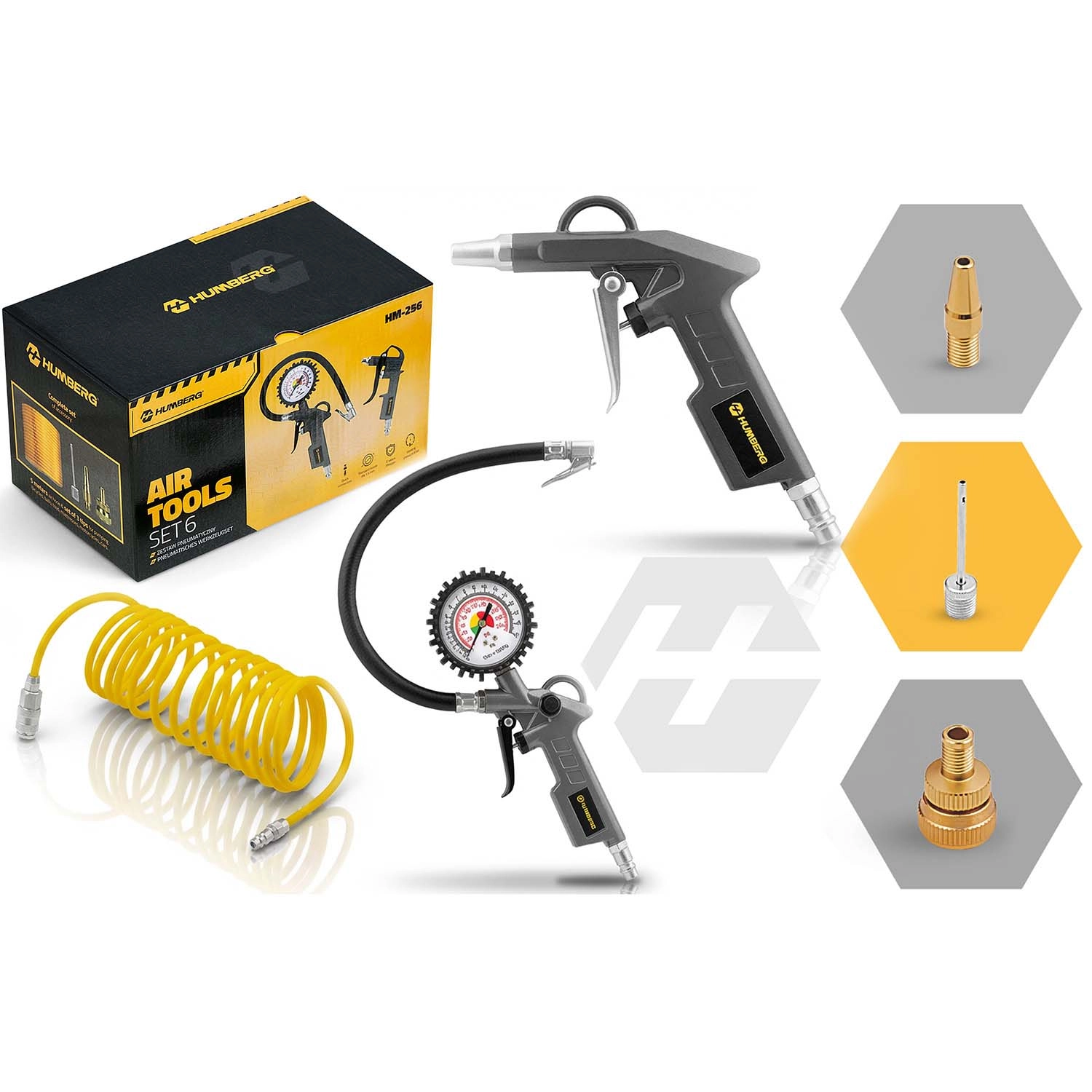 Universele 6-in-1 pneumatische gereedschapsset voor HUMBERG-compressor waarmee u comfortabel banden kunt oppompen, afblazen en reinigen, hogedrukreinigen en andere werkzaamheden in werkplaats of garage kunt uitvoeren. Bevat een pistool met manometer, blaaspistool, spiraalslang 5 m, set opzetstukken en een snelkoppeling voor snelle aansluiting. Bespaar tijd en geld en werk als in een professionele servicewerkplaats.