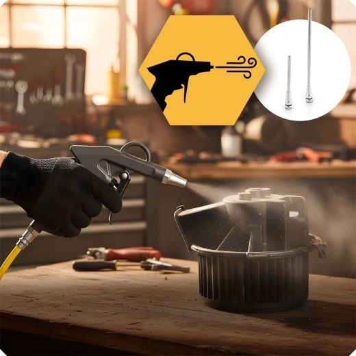 Het blaaspistool met smalle nozzle richt de luchtstroom precies daar waar nodig. Ideaal voor het verwijderen van stof en vuil uit mechanische onderdelen en moeilijk bereikbare plaatsen.