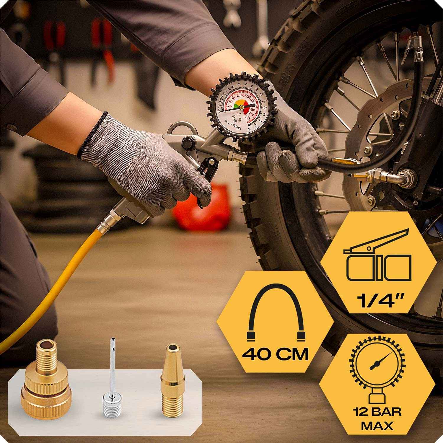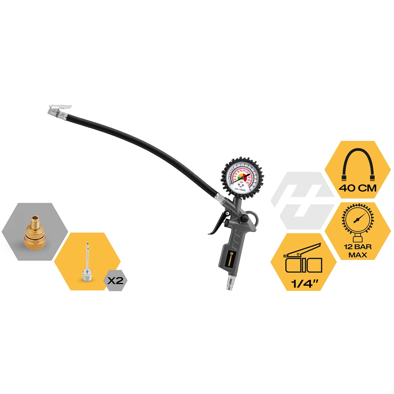 Het pistool met ronde analoge manometer maakt comfortabel oppompen van banden mogelijk met directe drukcontrole. De flexibele slang en de betrouwbare aansluiting zorgen voor een veilige koppeling met het ventiel.