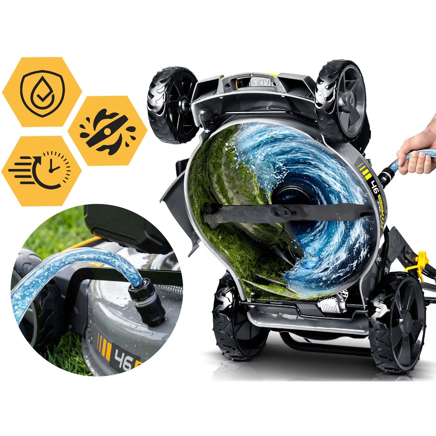 Deze benzinemaaier met zelfaandrijving is de ideale keuze voor gebruikers die prestaties, comfort en duurzaamheid willen combineren. Het hart van de machine is een viertakt OHV BRIGGS & STRATTON-motor met een cilinderinhoud van 140 cc en een vermogen van 2,01 kW, die zorgt voor een gemakkelijke start, stabiele loop en laag verbruik. De maaibreedte van 46 cm versnelt het werk in de tuin en de centrale maaihoogteverstelling in 6 niveaus (30–80 mm) laat u het gazon afstemmen op de actuele behoeften.