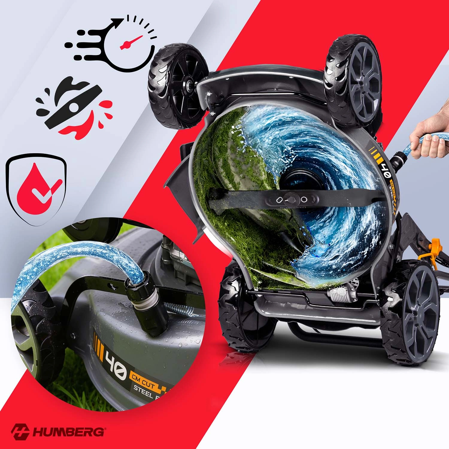 De robuuste stalen constructie met gehard stalen mes zorgt voor een zuivere snede zonder rafelen. Dankzij drie werkmodi – opvang in de bak, zijuitworp of mulchen – behaalt u steeds een perfect resultaat. De opvangbak van 45 l met vulindicator betekent minder onderbrekingen en vloeiender werken. Het chassis-reinigingssysteem met aansluiting voor een tuinslang vergemakkelijkt het onderhoud na het maaien.
