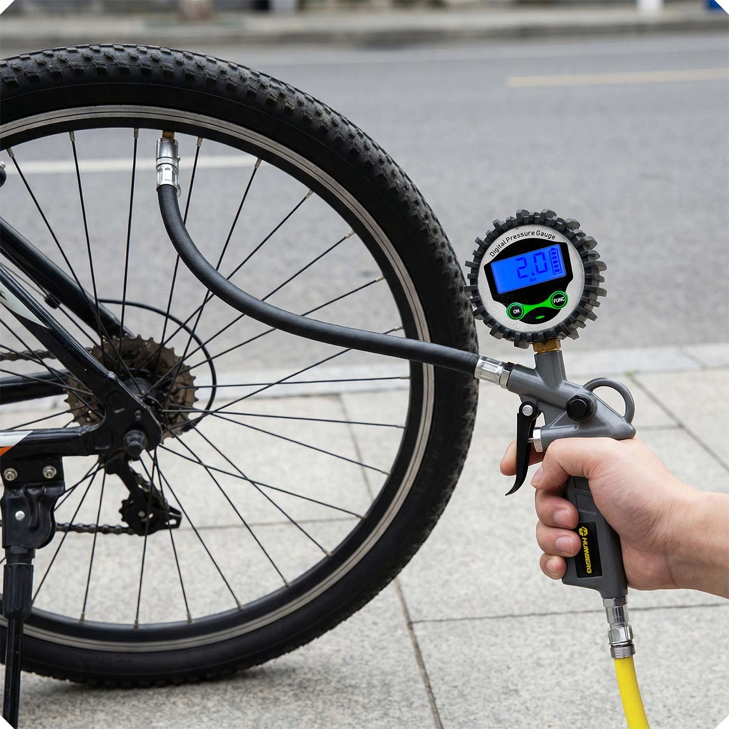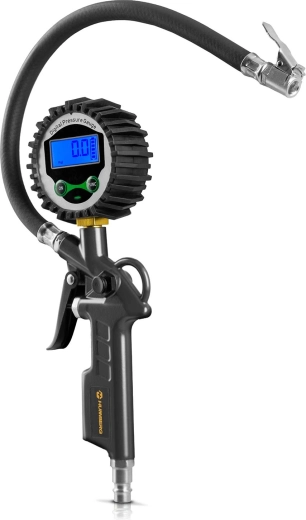 De digitale bandenvuller HUMBERG HM-260 is een betrouwbare helper voor auto, motor en fiets. Het grote, verlichte lcd‑scherm maakt directe en precieze uitlezing mogelijk, de schakelbare eenheden dekken alle gangbare standaarden en de ergonomische trekker zorgt voor vloeiend bijpompen tot exact de gewenste waarde.