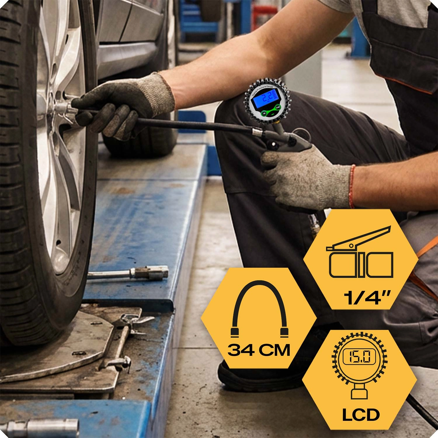 De flexibele slang van 34 cm verhoogt het werkcomfort en de standaard 1/4"-aansluiting garandeert brede compatibiliteit met zowel werkplaats- als thuiscompressoren. De robuuste rubberen randbescherming van de manometer beschermt het apparaat tegen schokken, ideaal voor garage, service en onderweg.