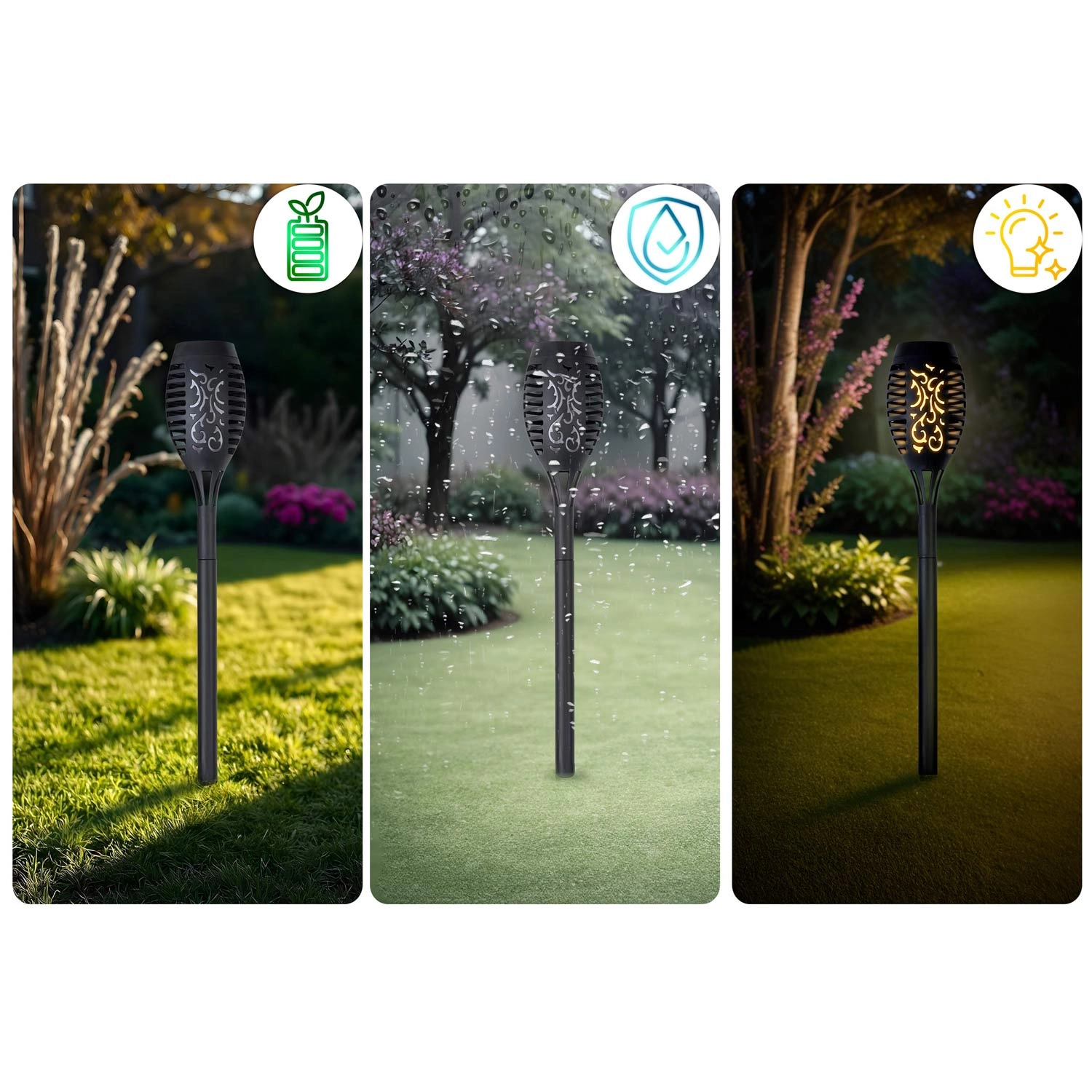 IPX4‑afdichting en lichtgewicht kunststof behuizing. Steek ze simpelweg in de grond en klaar.