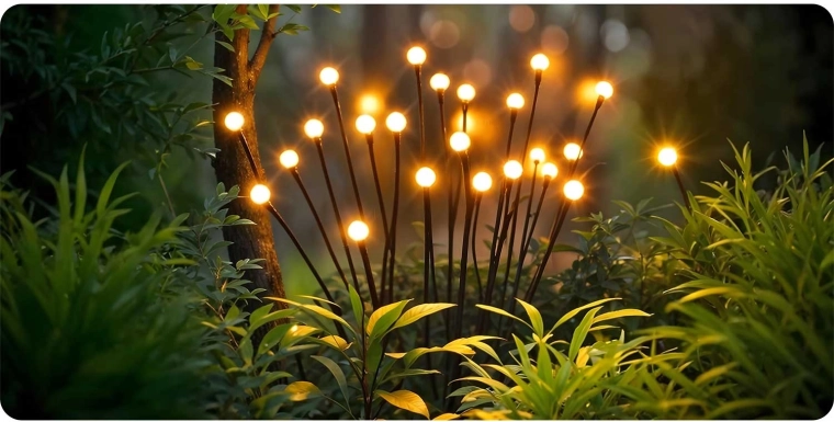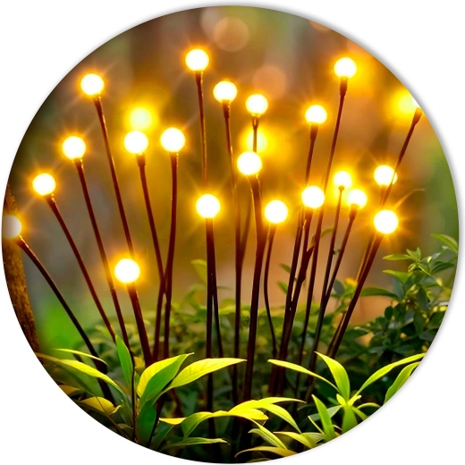 Meerdere buigzame stelen met warme LED-bolletjes creëren subtiele fonkeling tussen planten en langs paadjes – natuurlijk, decoratief en zeer sfeervol.