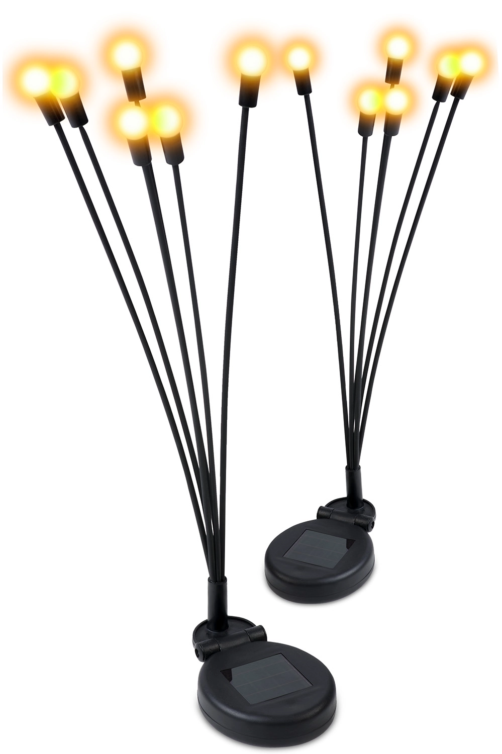 Creëer ’s avonds een sprookjesachtige sfeer. Deze set van 2 zonne- tuinlampen met vuurvliegjes biedt warm wit decoratief licht uit 6 lichtgevende bolletjes op buigzame stelen, automatische inschakeling dankzij een schemersensor en draadloze werking met een amorfe zonnecel. Met IPX4-bestendigheid, een 150 mAh Ni‑MH-accu en een handige ON/OFF-schakelaar voor zorgeloos gebruik.