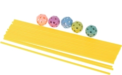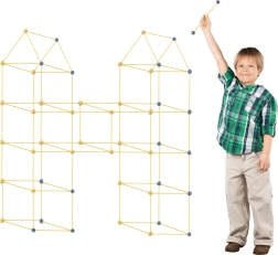 Ontdek de magie van creatief bouwen met onze geweldige bouwset, waarmee kinderen verschillende structuren kunnen bouwen, zoals tenten, bases of zelfs hondenhokken! De set bevat 75 onderdelen, inclusief 51 gele stokjes en 24 kleurrijke verbindingsballen die oneindige bouwmogelijkheden bieden.
