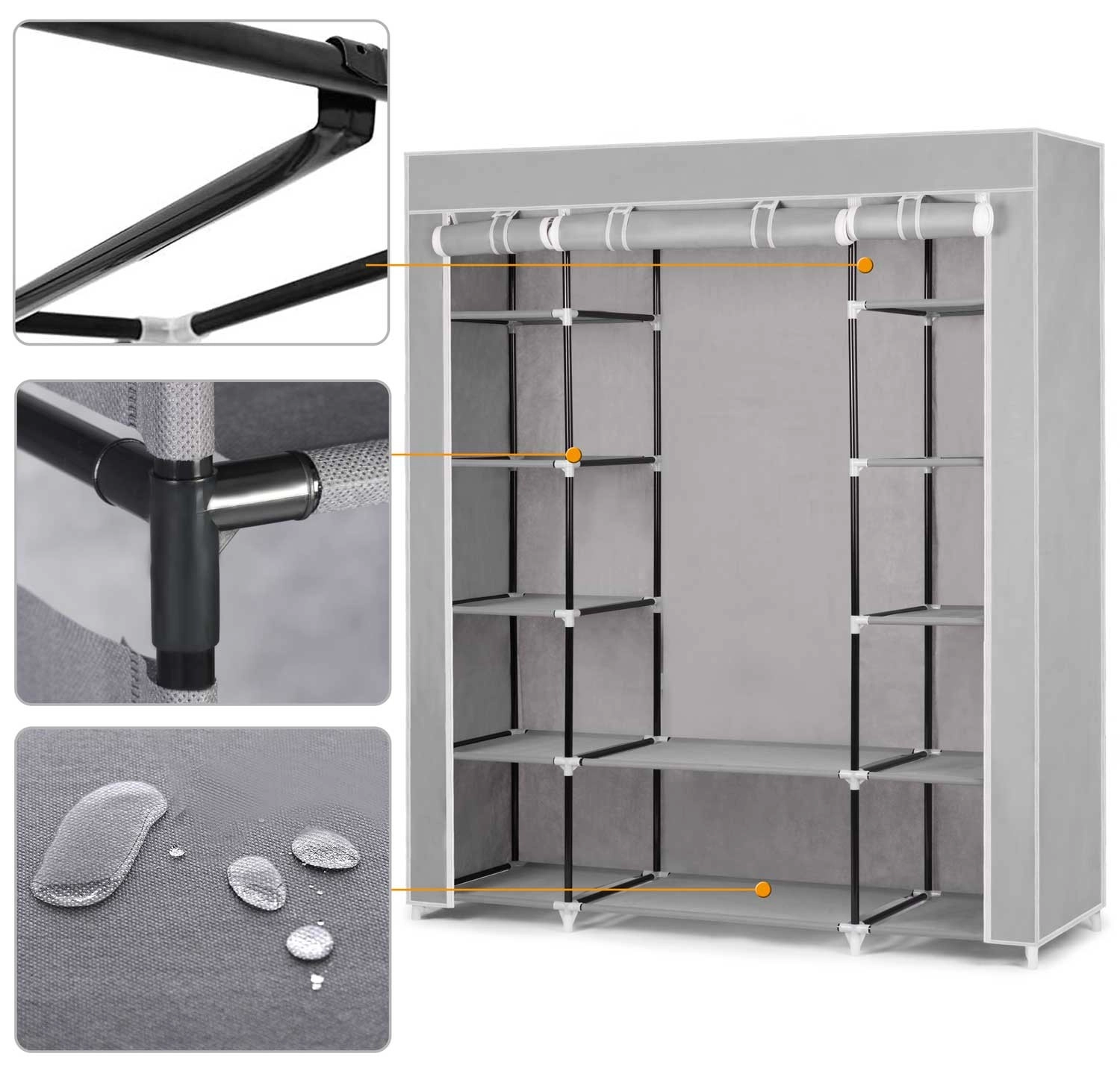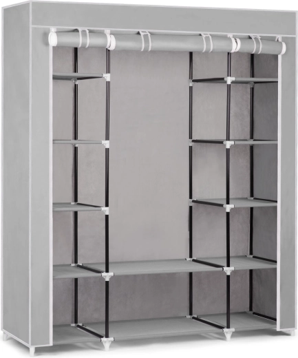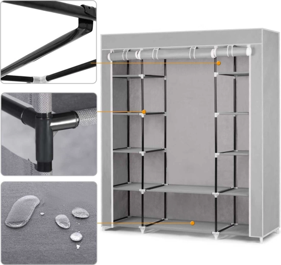 De textielkast Massido – grijs is de ideale oplossing voor slaapkamers, inloopkasten, gangen en studentenkamers. Het duurzame stalen frame met stevige PP-connectoren en de waterdichte hoes zorgen voor een lange levensduur, zelfs bij dagelijks gebruik. Dankzij de doordachte indeling van planken en kledingroede berg je gemakkelijk kleding, accessoires en schoenen op.