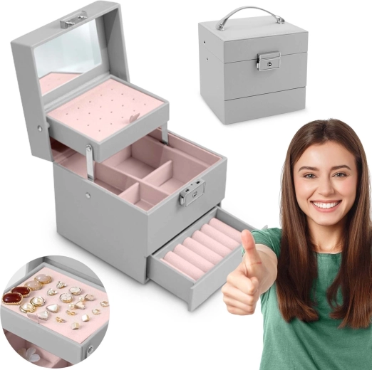 De elegante grijze sieradendoos van Massido biedt compacte afmetingen, een overzichtelijke organisatie van sieraden en veilig afsluiten met een sleutelslot. Binnenin vind je een spiegeltje, een paneel voor oorbellen, uitneembare vakken en een lade voor ringen. Duurzaam PU eco-leer met een fluweelzacht roze interieur beschermt je sieraden en dankzij het handvat is de doos ook ideaal voor op reis.