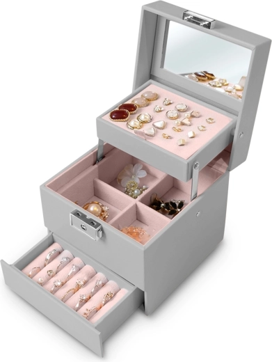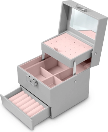 Een stijlvolle en functionele sieradendoos in modern grijs die premium materialen combineert met een slimme interne indeling. De spiegel in het deksel, het uitneembare oorbellenpaneel, de ingedeelde vakken voor kettingen en armbanden en de aparte lade met rollen voor ringen houden elke collectie perfect geordend.