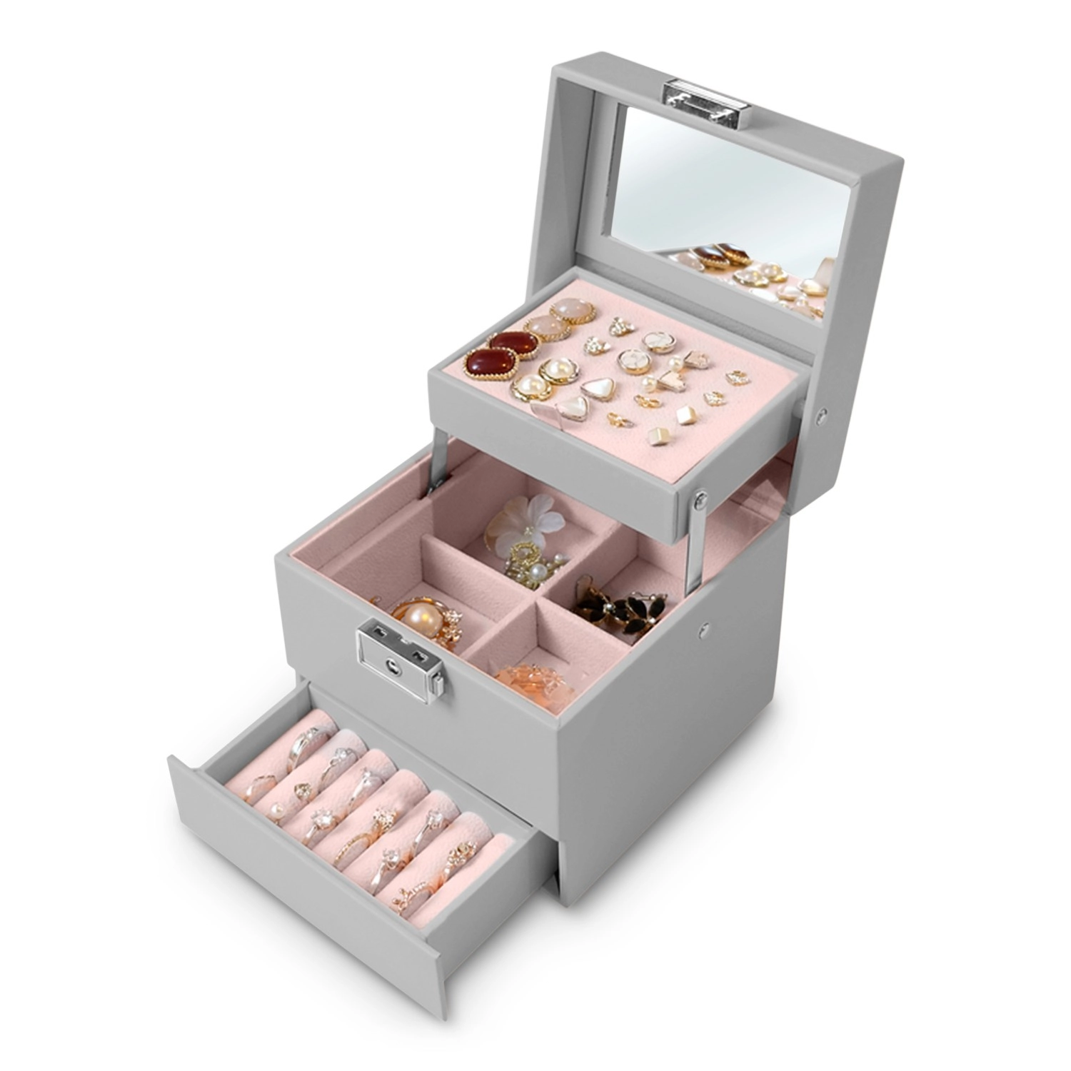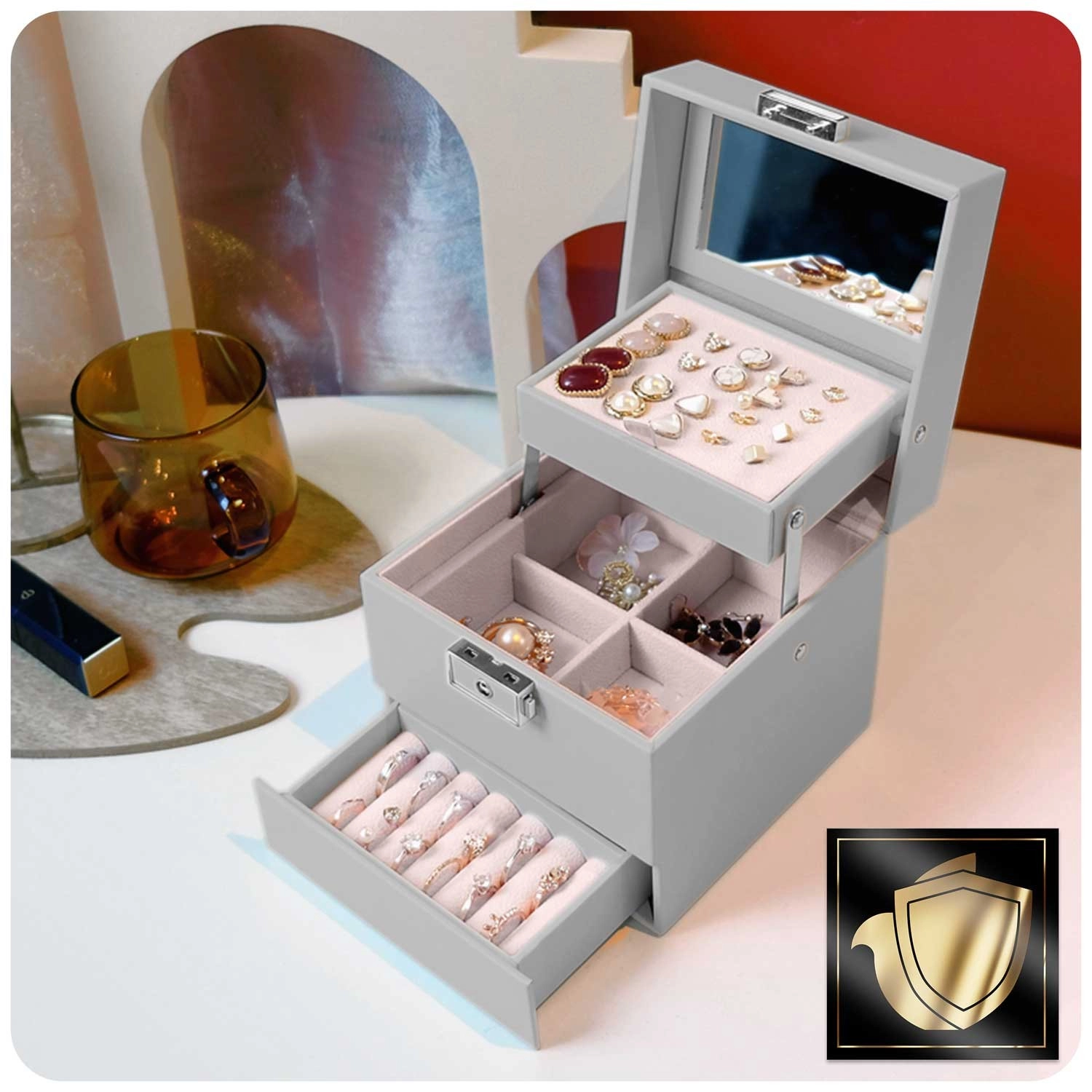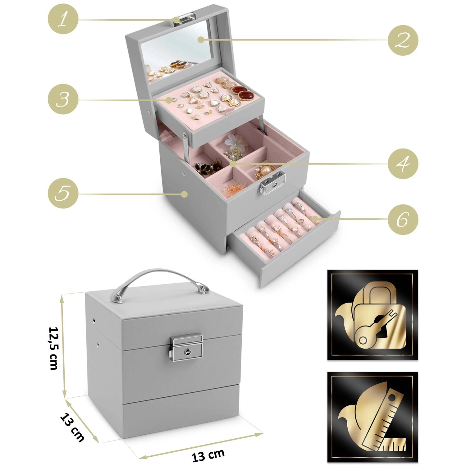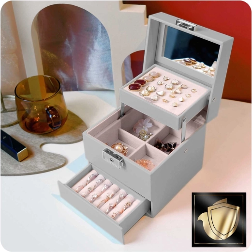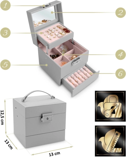De geïntegreerde spiegel en het sleutelslot beschermen je sieraden en maken snelle controle van je look altijd en overal mogelijk.