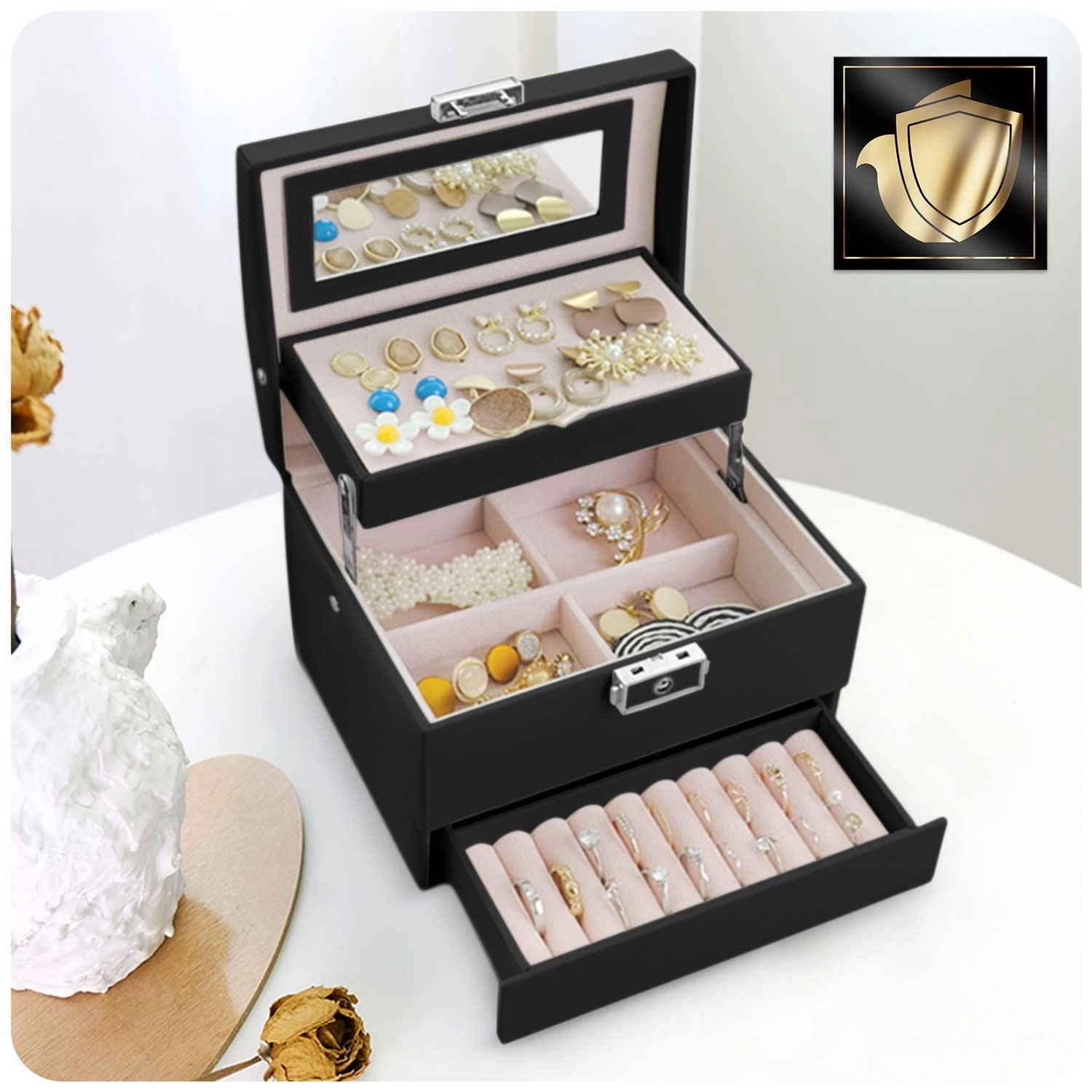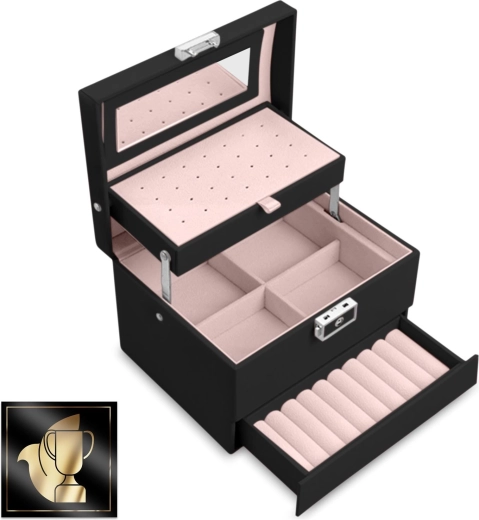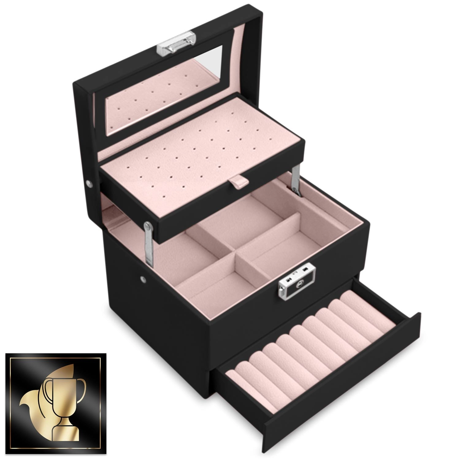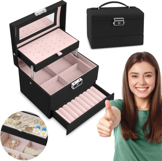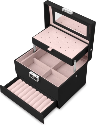 Elegante sieradendoos met meerniveausindeling, spiegeltje en een afsluitbaar metalen slot om ringen, oorbellen en armbanden veilig op te bergen. Compacte afmetingen, een praktisch handvat voor eenvoudig meenemen en zachte roze bekleding beschermen sieraden tegen beschadiging. De zeer duurzame PU-eco-leer en zorgvuldige afwerking zorgen voor een premium uitstraling en lange levensduur.