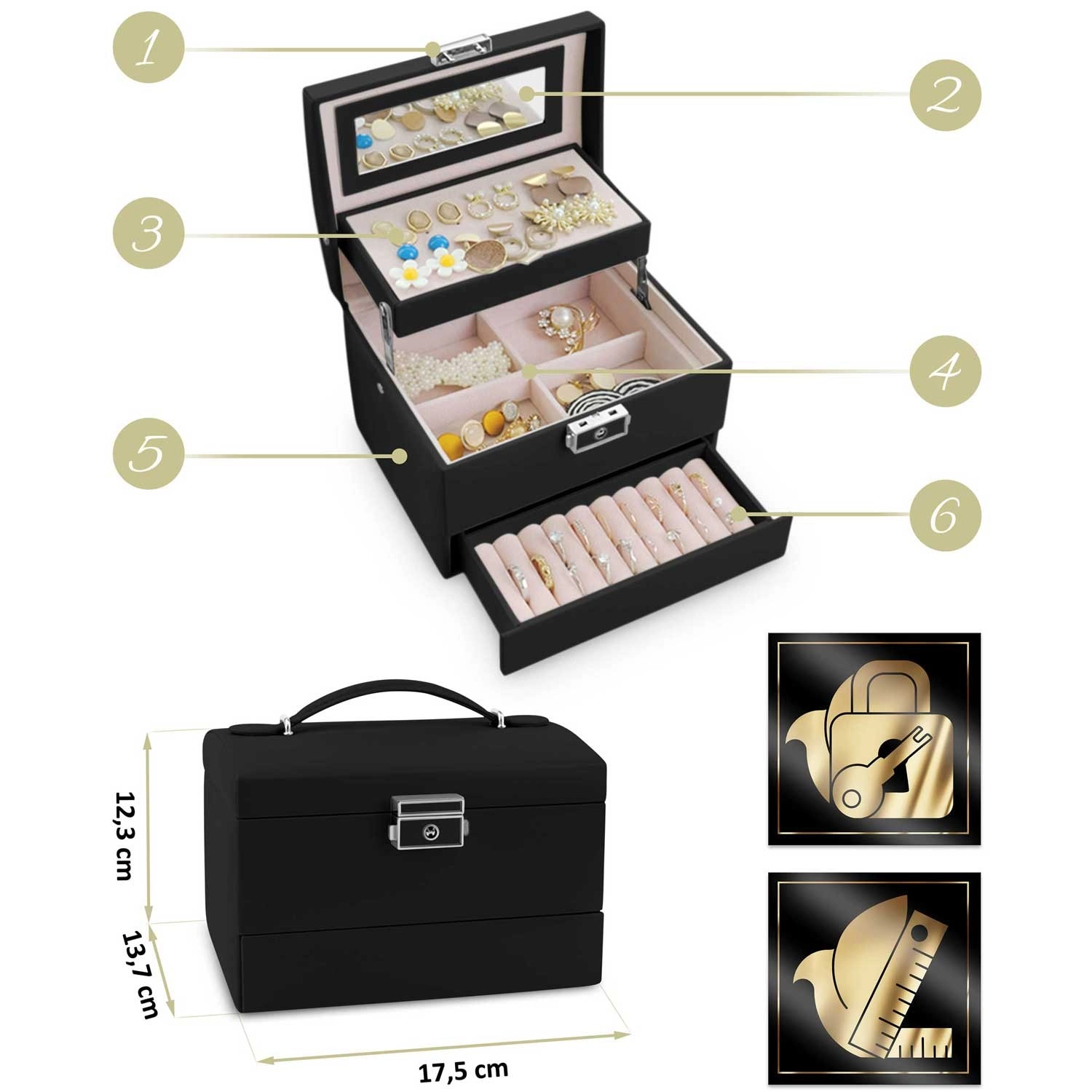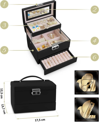 - Slimme indeling: vakken voor armbanden en hangers, uitneembare lade met perforatie voor steekoorbellen, lade met ringrollen.