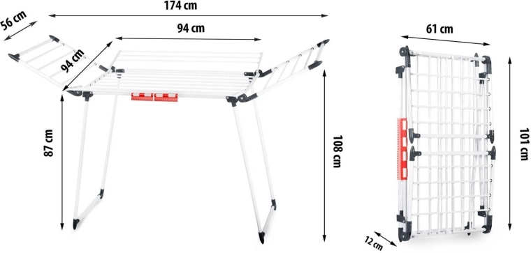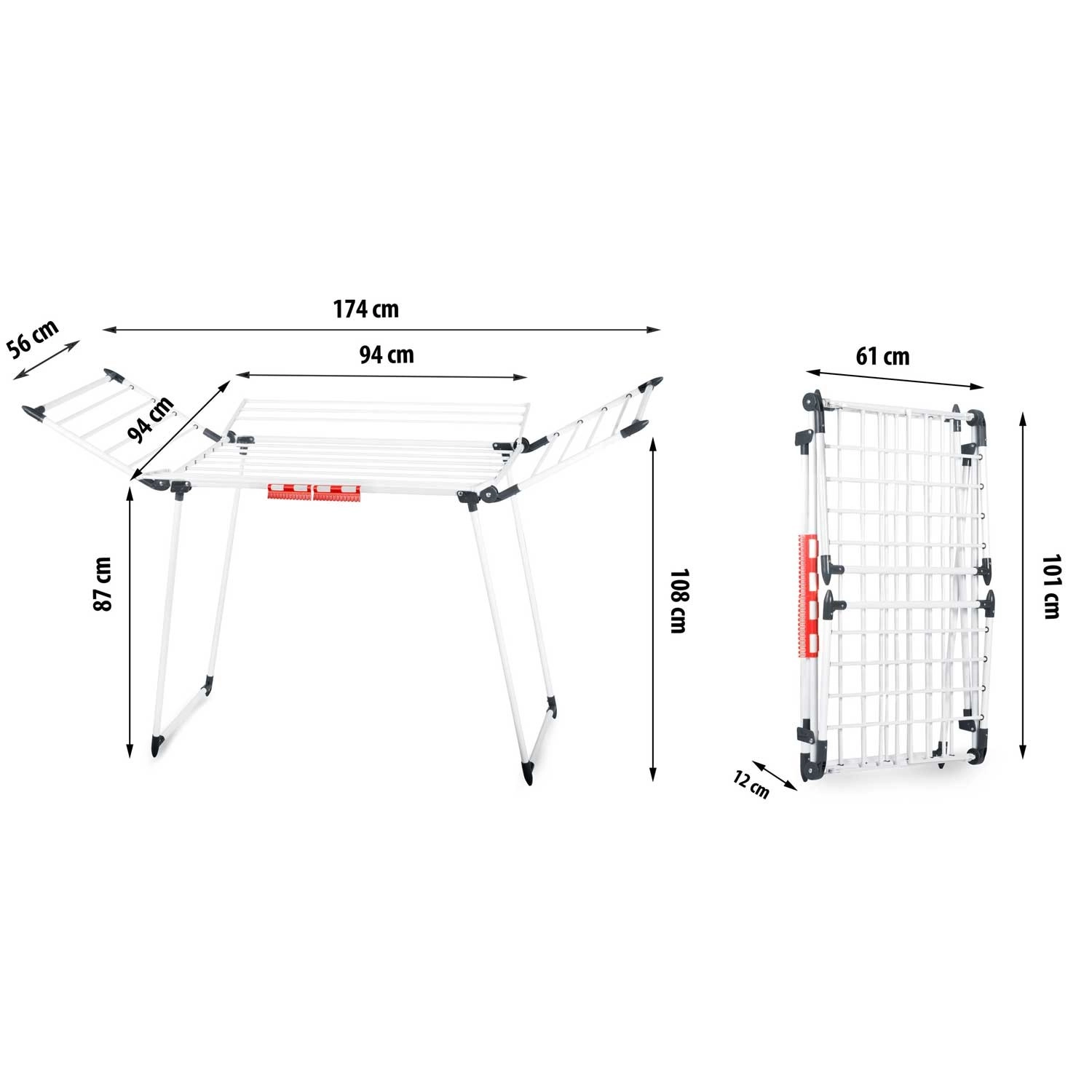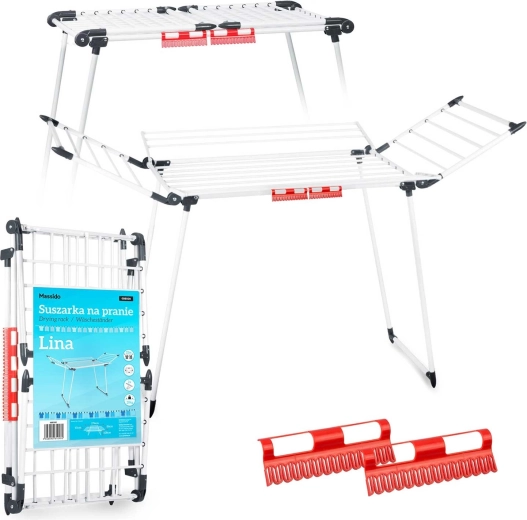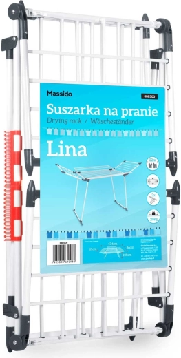 Praktisch en ruim wasrek MASSIDO Lina biedt tot 22 m droogoppervlak, 4 uitklapbare vleugels en houders voor klein wasgoed. Dankzij de robuste metalen constructie is het stabiel, makkelijk in- en uit te klappen en de dikkere spijlen helpen onnodige vouwen te verminderen. Ideaal voor snel en zacht drogen, zowel thuis als op het balkon.