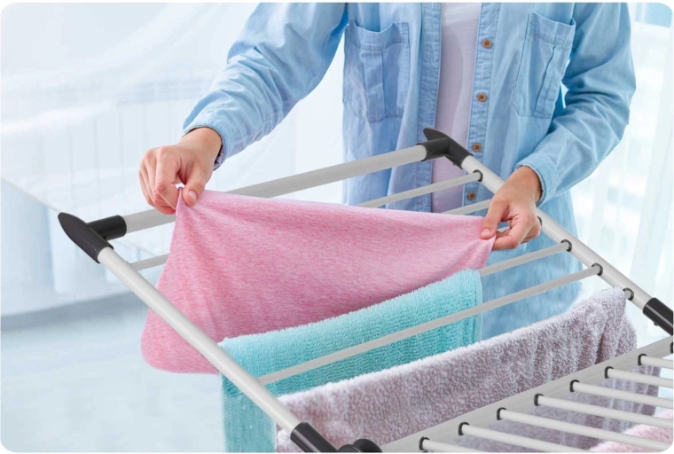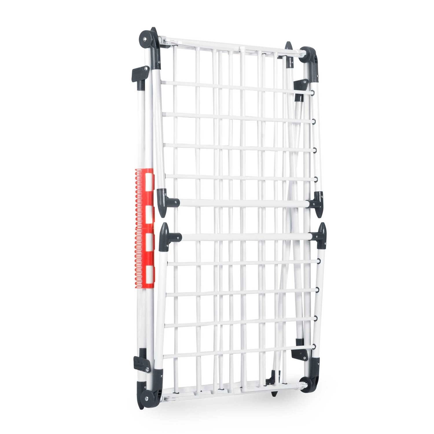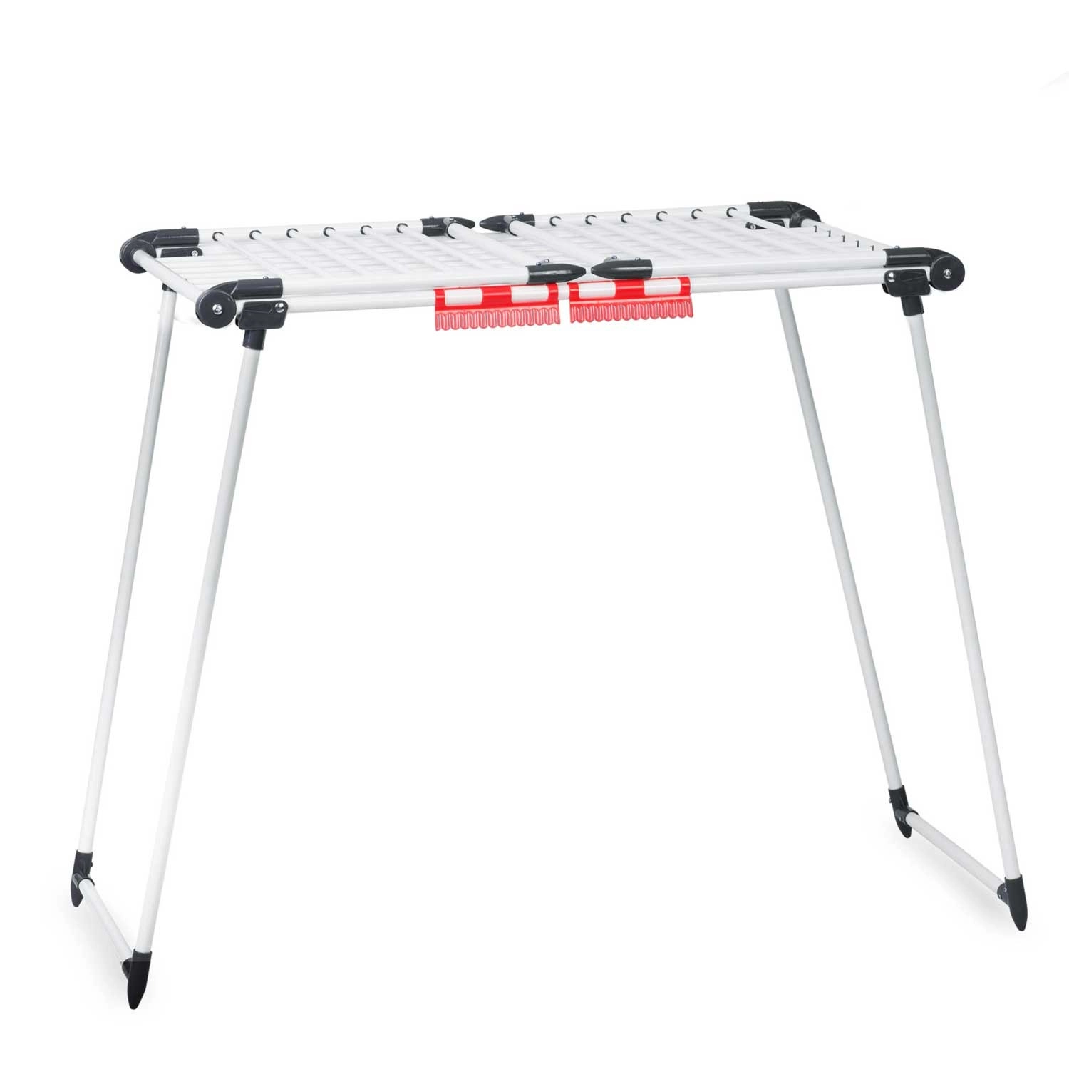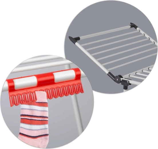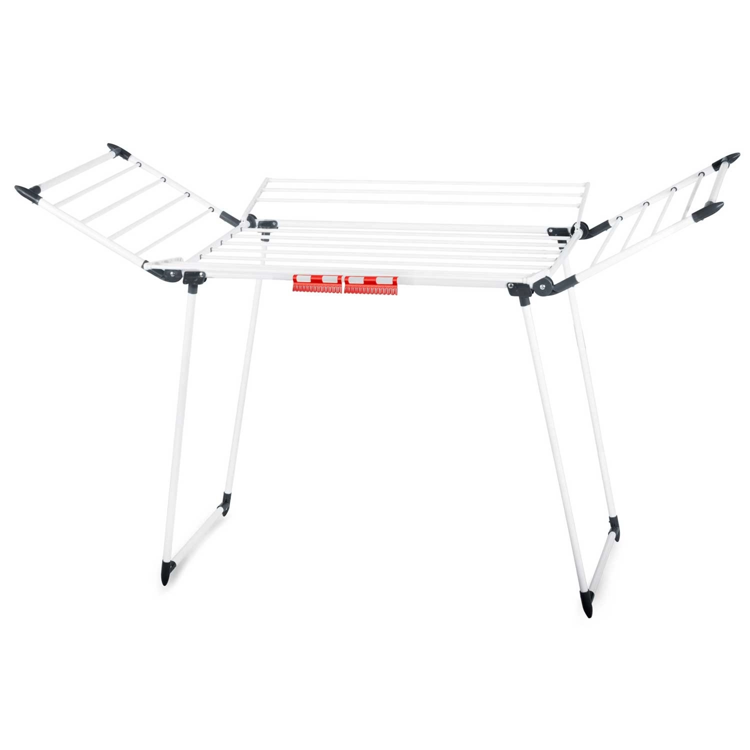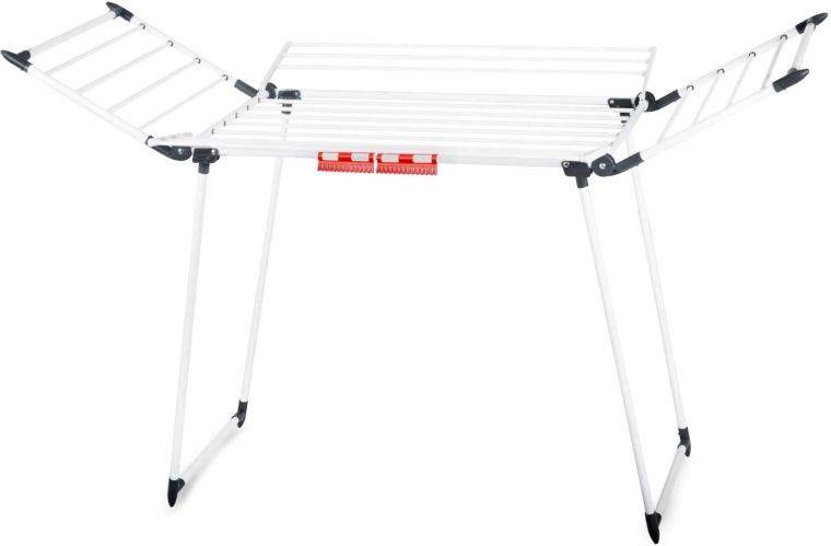 4 uitklapbare vleugels vergroten het droogoppervlak precies wanneer u dat nodig hebt, terwijl speciale houders voor ondergoed en klein wasgoed ruimte besparen op de hoofdspijlen. De dikke stangen helpen bovendien kreuken te beperken, waardoor kleding vaak niet eens gestreken hoeft te worden.