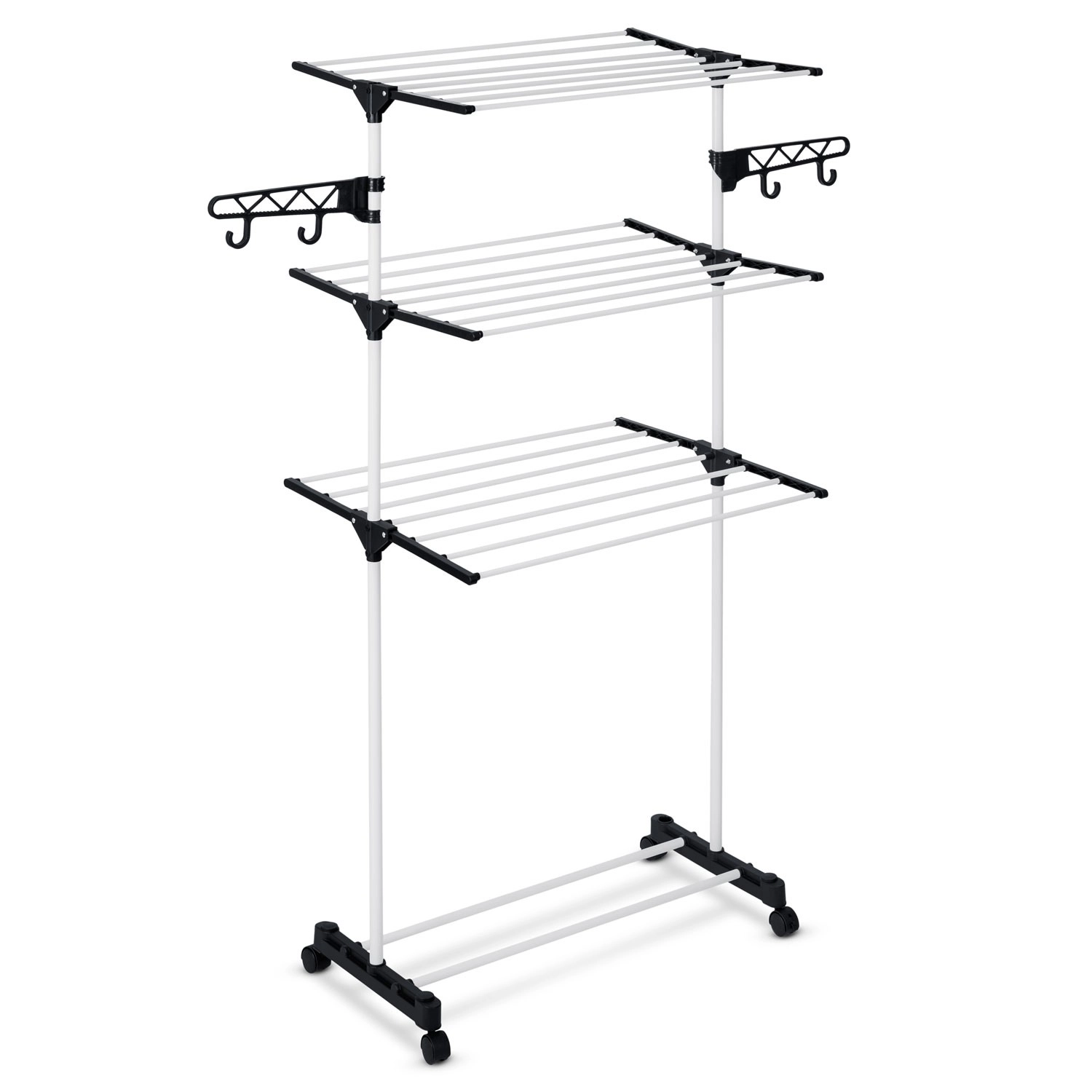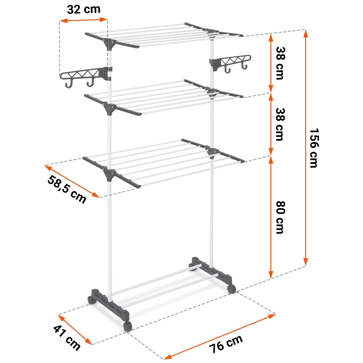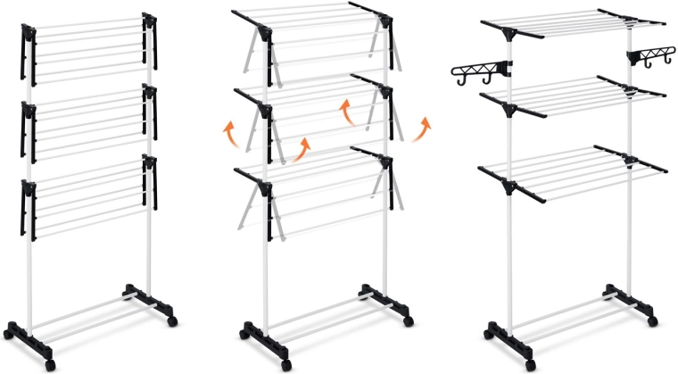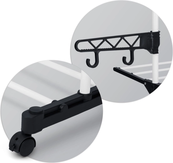 - Brede spijlen voor minder kreuken, haken en openingen voor kleerhangers en klein wasgoed, snel inklappen