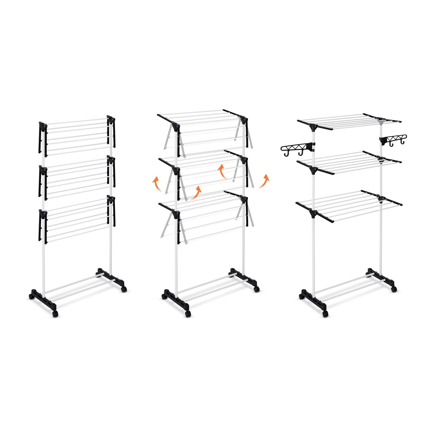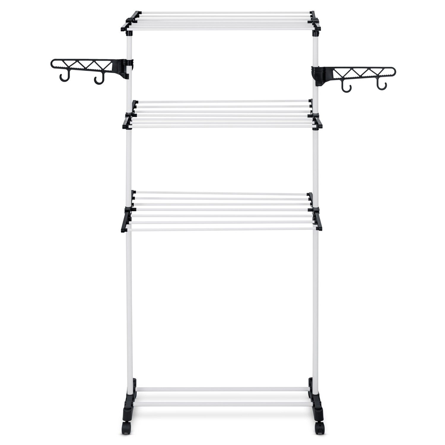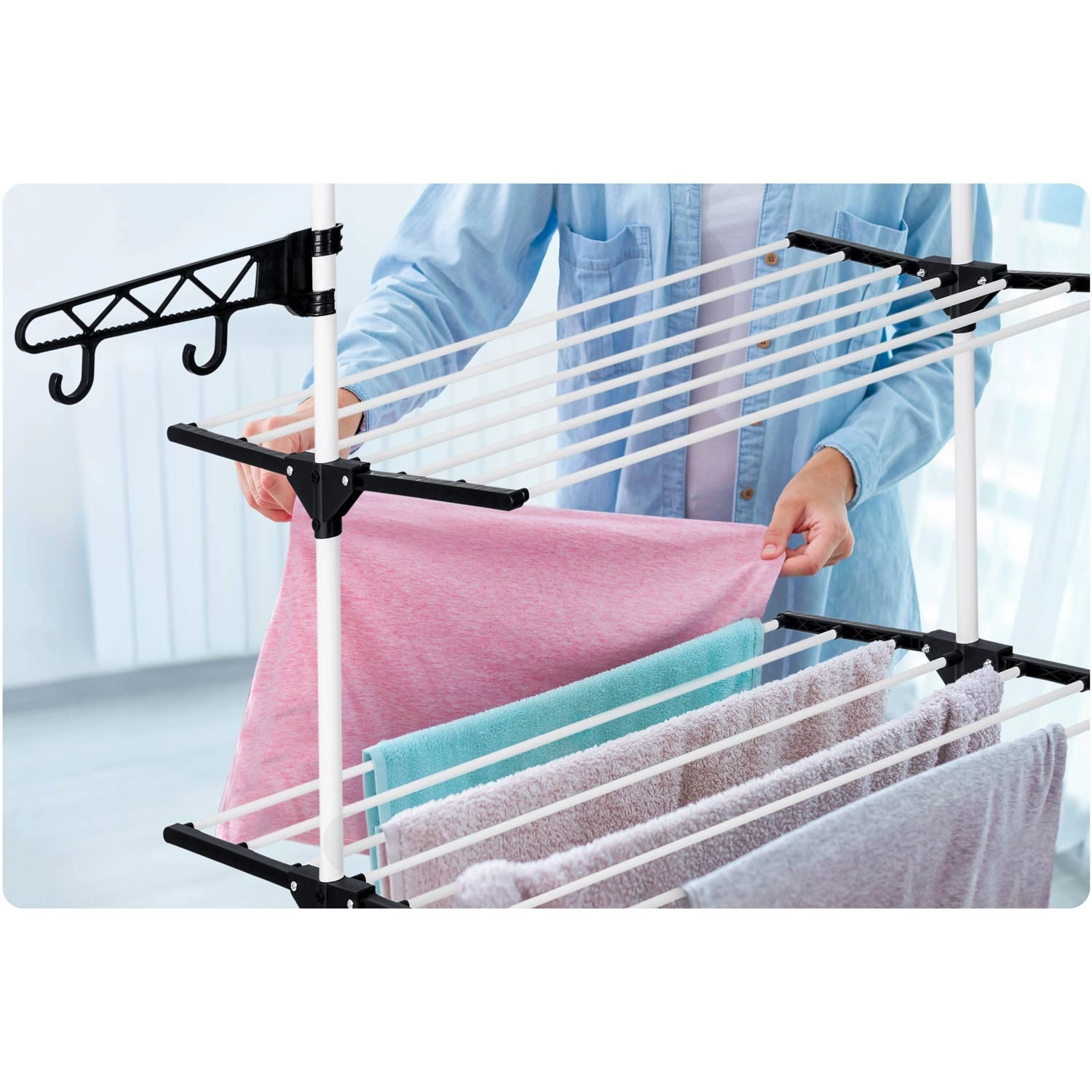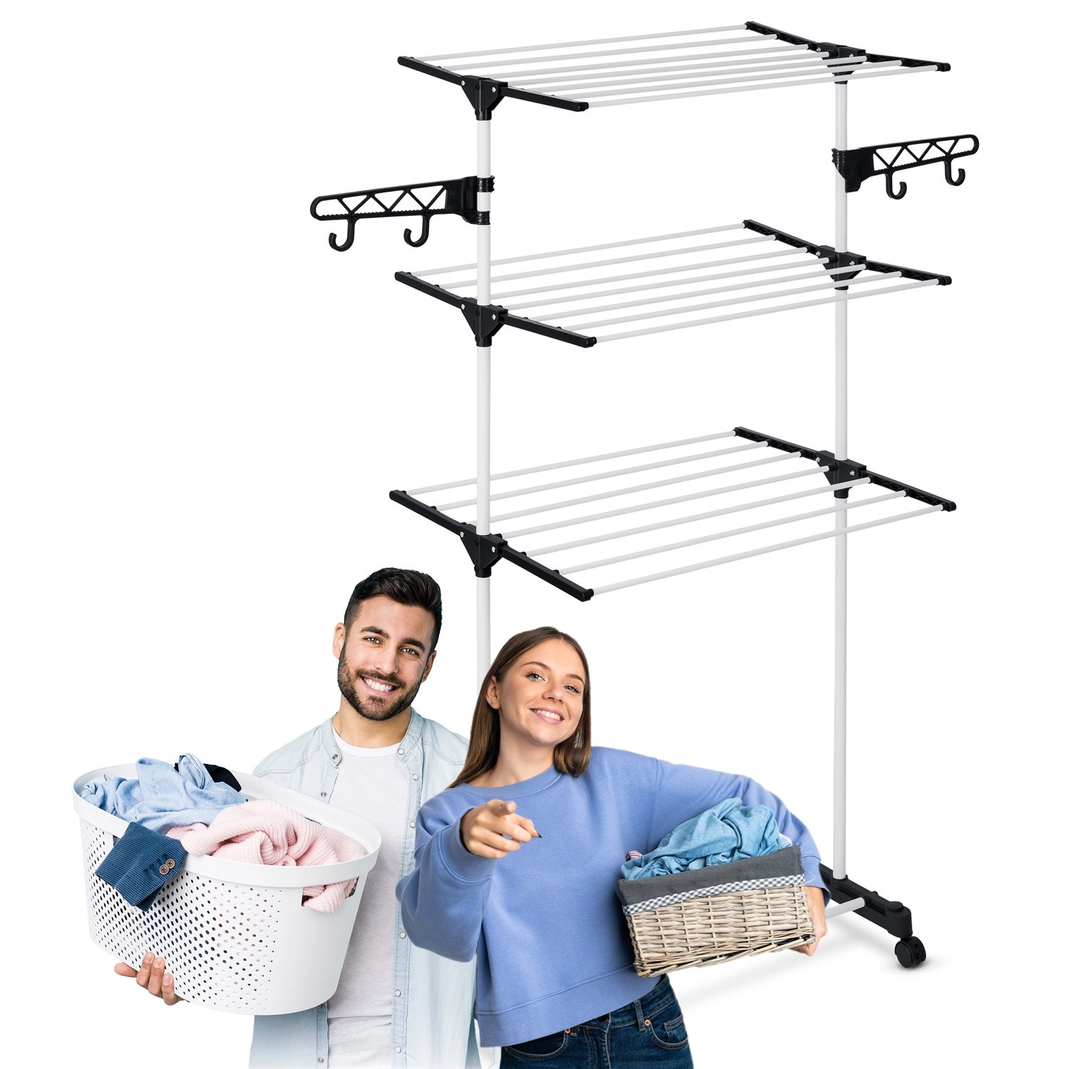Zes inklapbare niveaus bieden flexibel drogen van T-shirts tot handdoeken. Verbredede spijlen verminderen kreukvorming, waardoor strijken vaak niet nodig is. Praktische zijhaken en openingen voor kleerhangers en klein wasgoed besparen ruimte op de hoofdrekken. Dankzij de doordachte tussenruimtes tussen de stangen circuleert de lucht vrij en droogt het wasgoed snel en gelijkmatig.