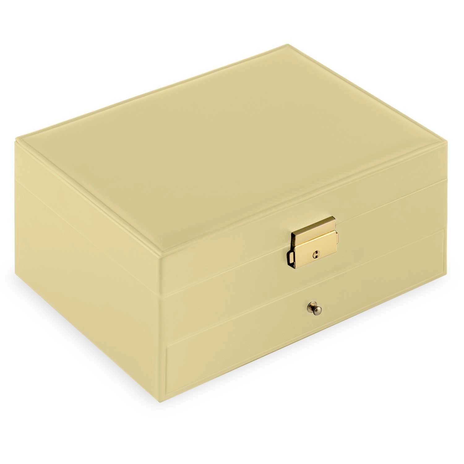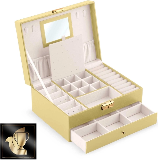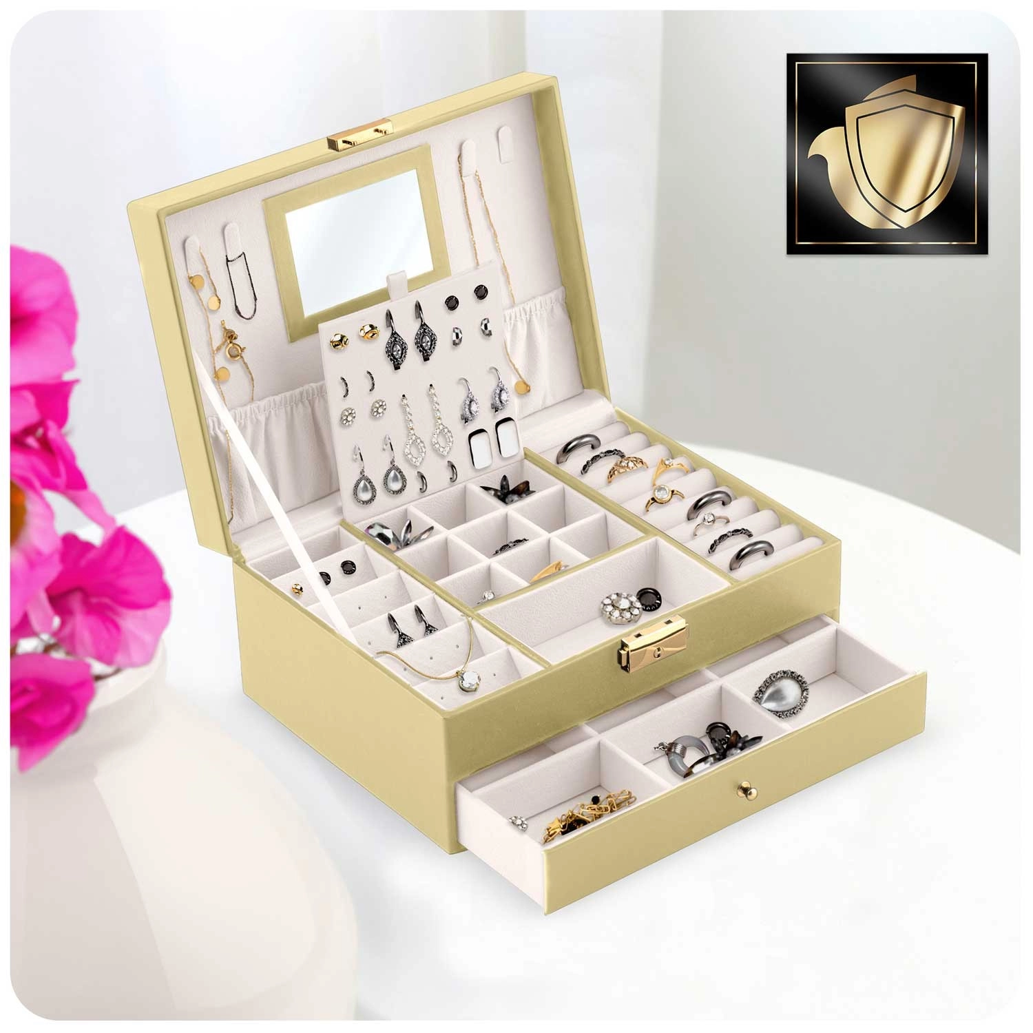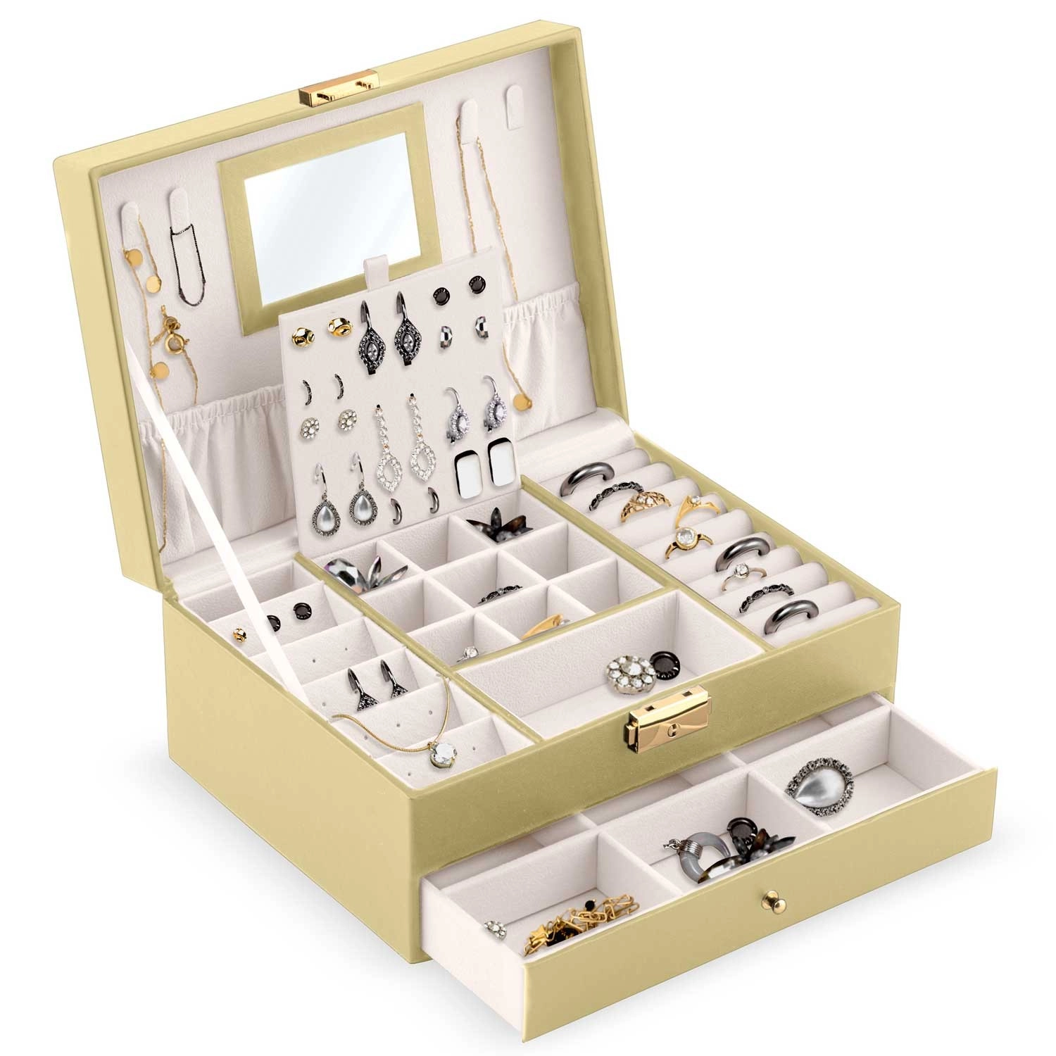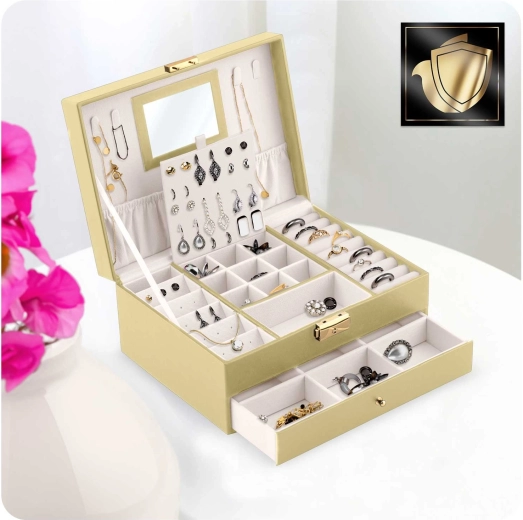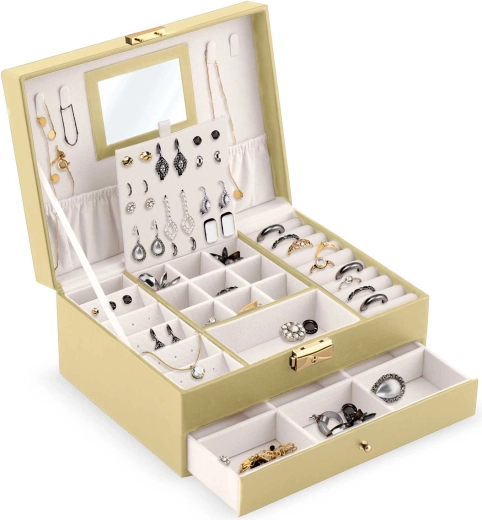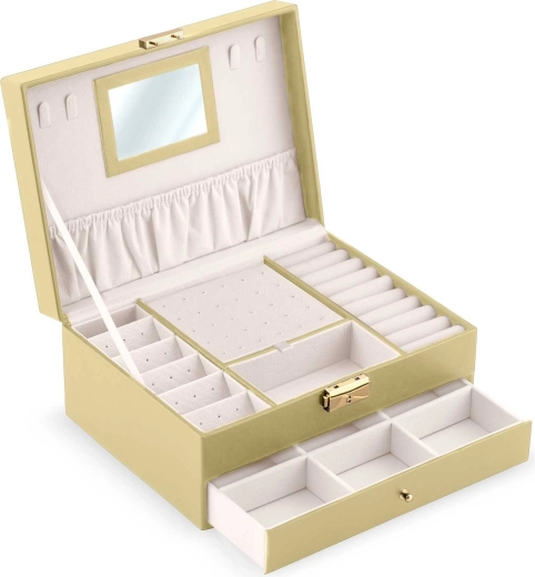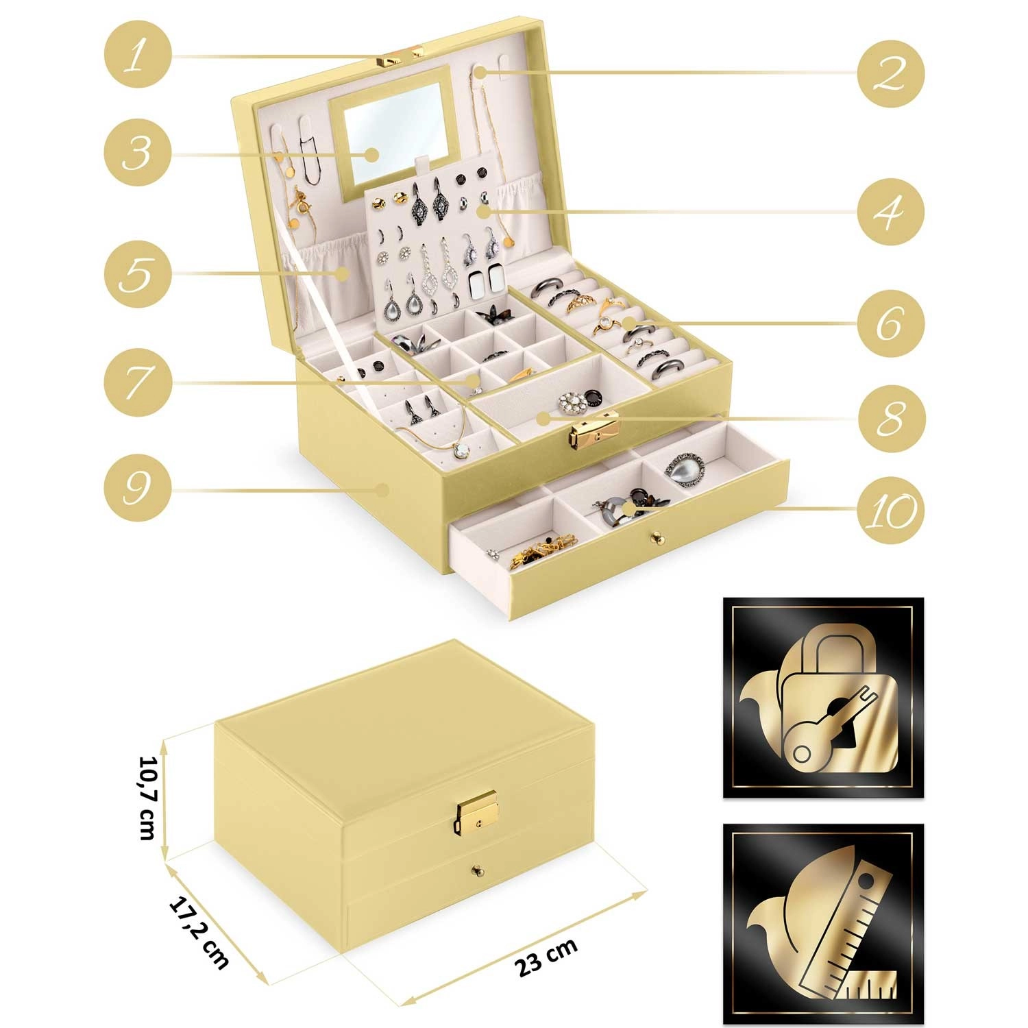Dankzij de compacte afmetingen van 23 × 17,2 × 10,7 cm plaats je haar eenvoudig op een kaptafel of in een lade. Het deksel met spiegeltje wordt aangevuld met haakjes voor kettingen en een elastisch vak, de bovenste laag biedt ringenrollen en gescheiden vakken, en het onderste deel bestaat uit een uittrekbare lade met extra verdelers. Het duurzame PU-ecoleer is onderhoudsvriendelijk en blijft lang mooi.