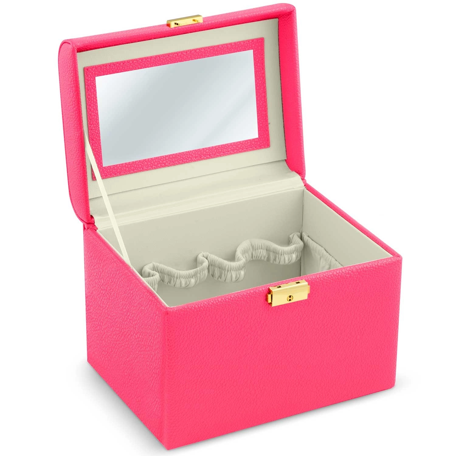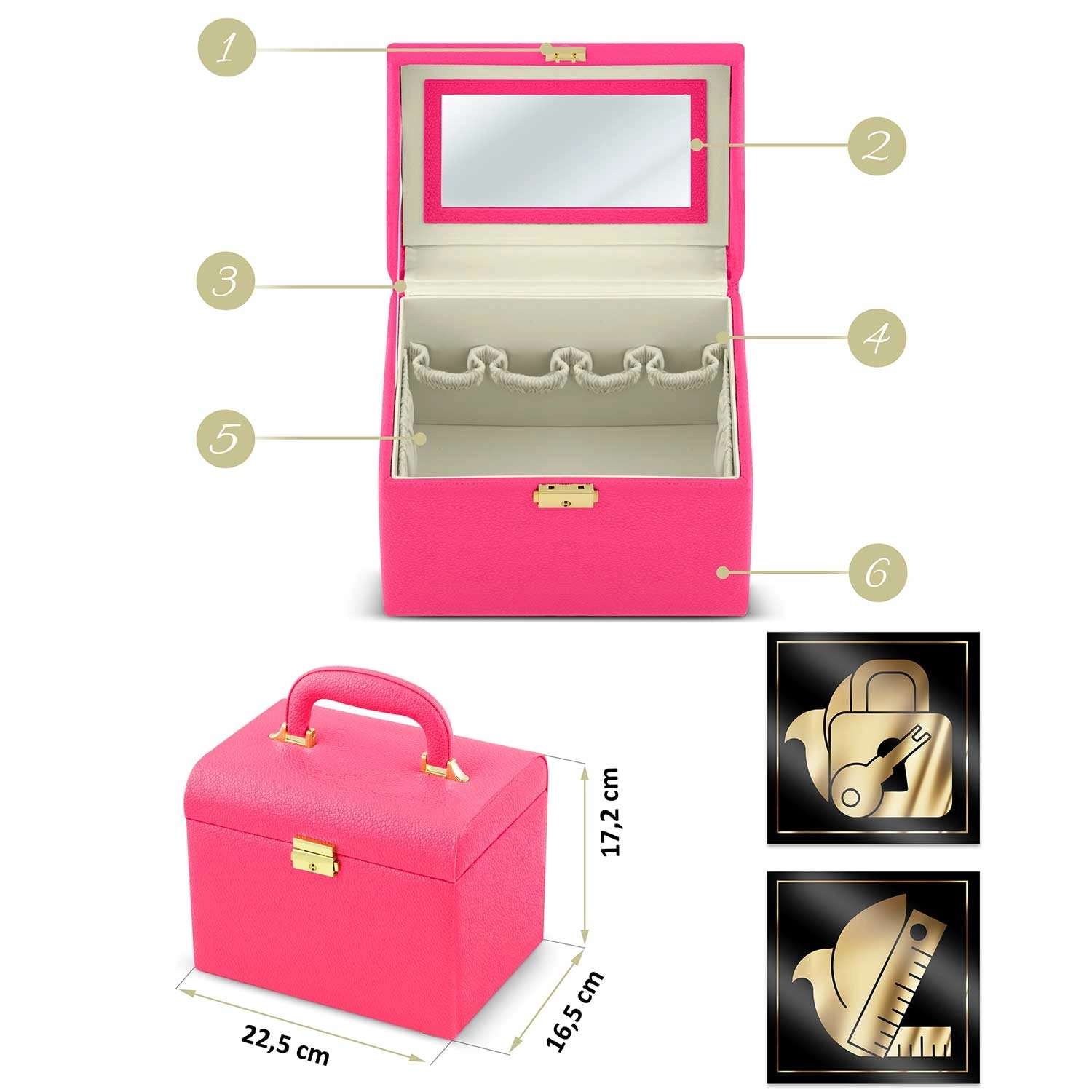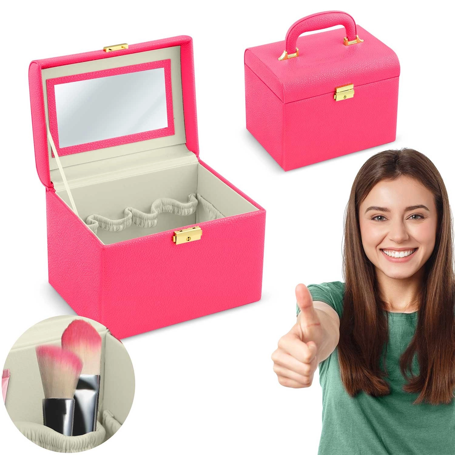 Het duurzame PU-eco‑leer beschermt de inhoud tegen krassen en slijtage, terwijl het slot ongewenst openen tijdens het reizen voorkomt. Binnenin vind je een spiegel, elastische zakken en vakken voor kwasten, lipsticks, sieraden en kleine accessoires – alles overzichtelijk en veilig opgeborgen.