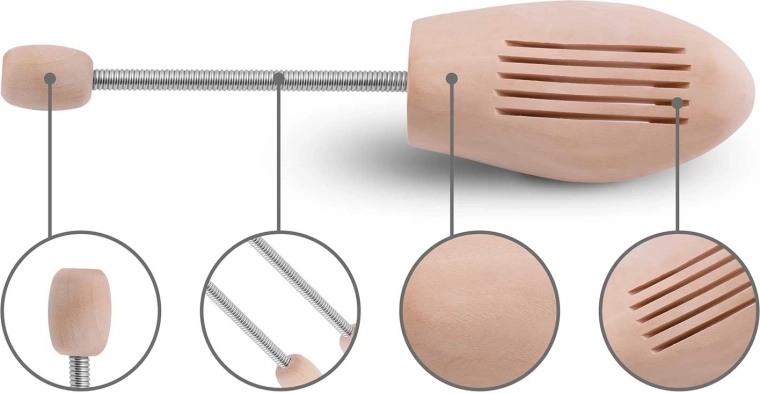 Een sterke maar zachte veer past automatisch de lengte en breedte aan, zodat de schoenen hun vorm behouden en er geen kreuken ontstaan bij het buigen.