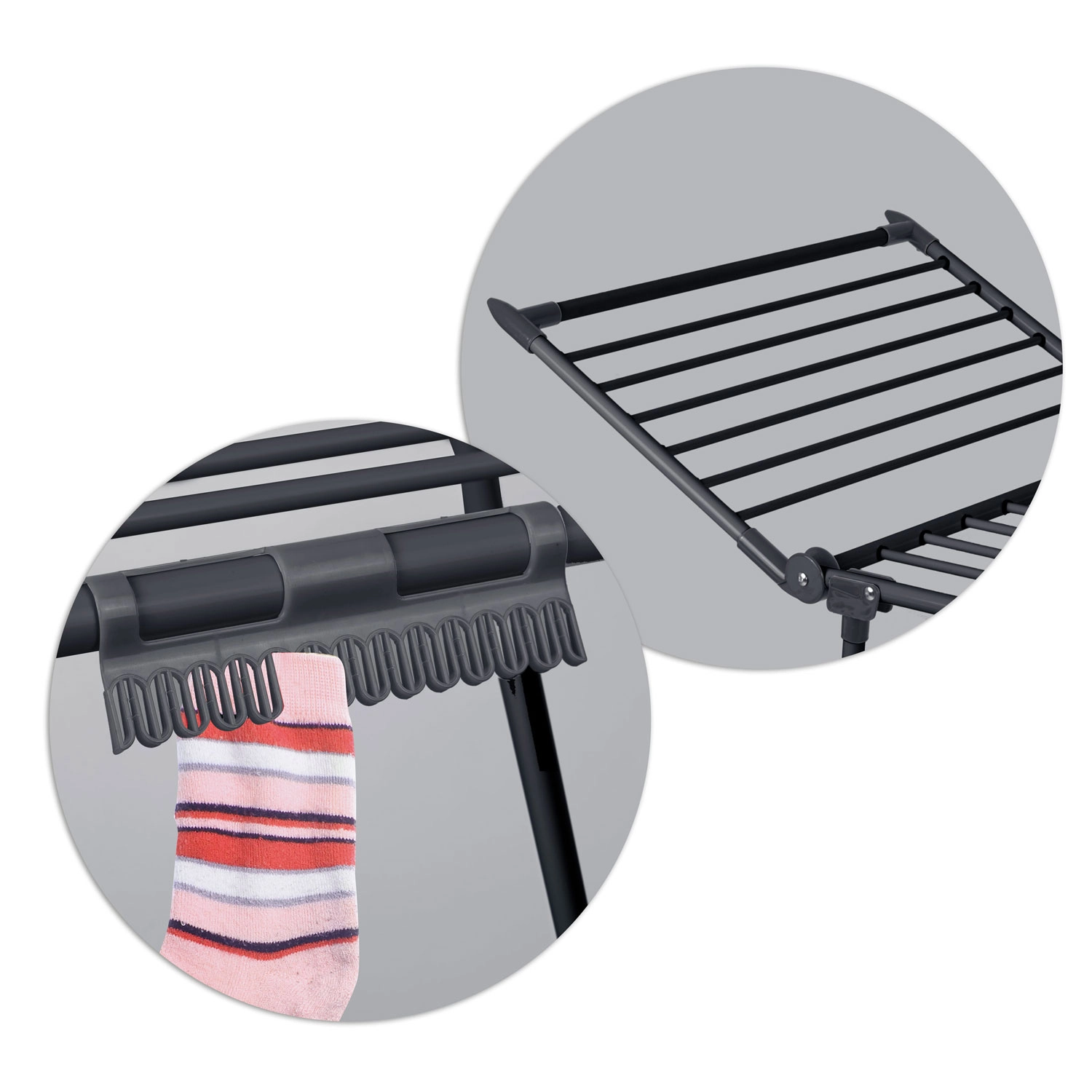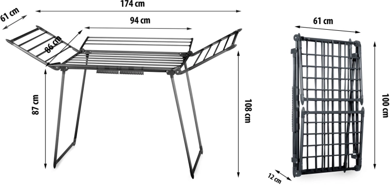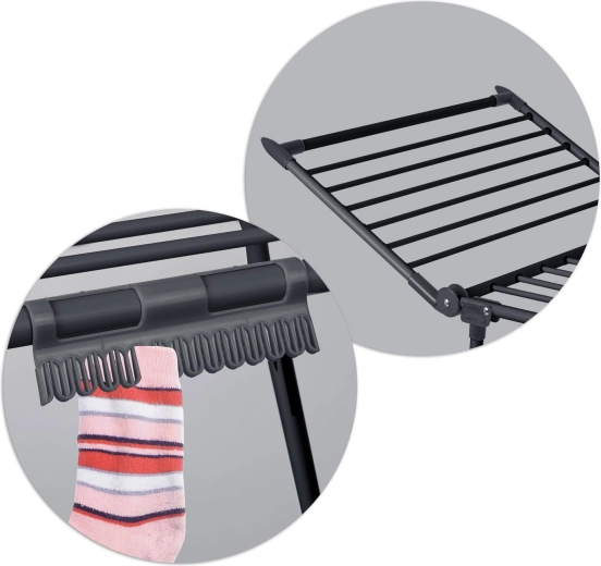 Dikkere spijlen verdelen het gewicht van het wasgoed en helpen kreukvorming te beperken, waardoor je vaak niet hoeft te strijken. Doordachte afstanden tussen de stangen bevorderen luchtcirculatie voor een gelijkmatig en snel droogresultaat. Praktische houders voor kleine stukken besparen plaats op de hoofdstangen en de 4 inklapbare vleugels pas je eenvoudig aan de lengte en het type kleding aan.