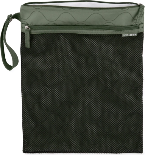 Geen doorweekte tassen of rommel meer. De waterdichte zak SKIP HOP Grab & Go in de tint Dark Sage biedt twee aparte vakken met rits voor natte en droge spullen. Het voorste mesh-gedeelte zorgt voor luchtcirculatie en direct zicht op de inhoud, terwijl het bovenste compartiment natte of vuile items veilig opbergt.