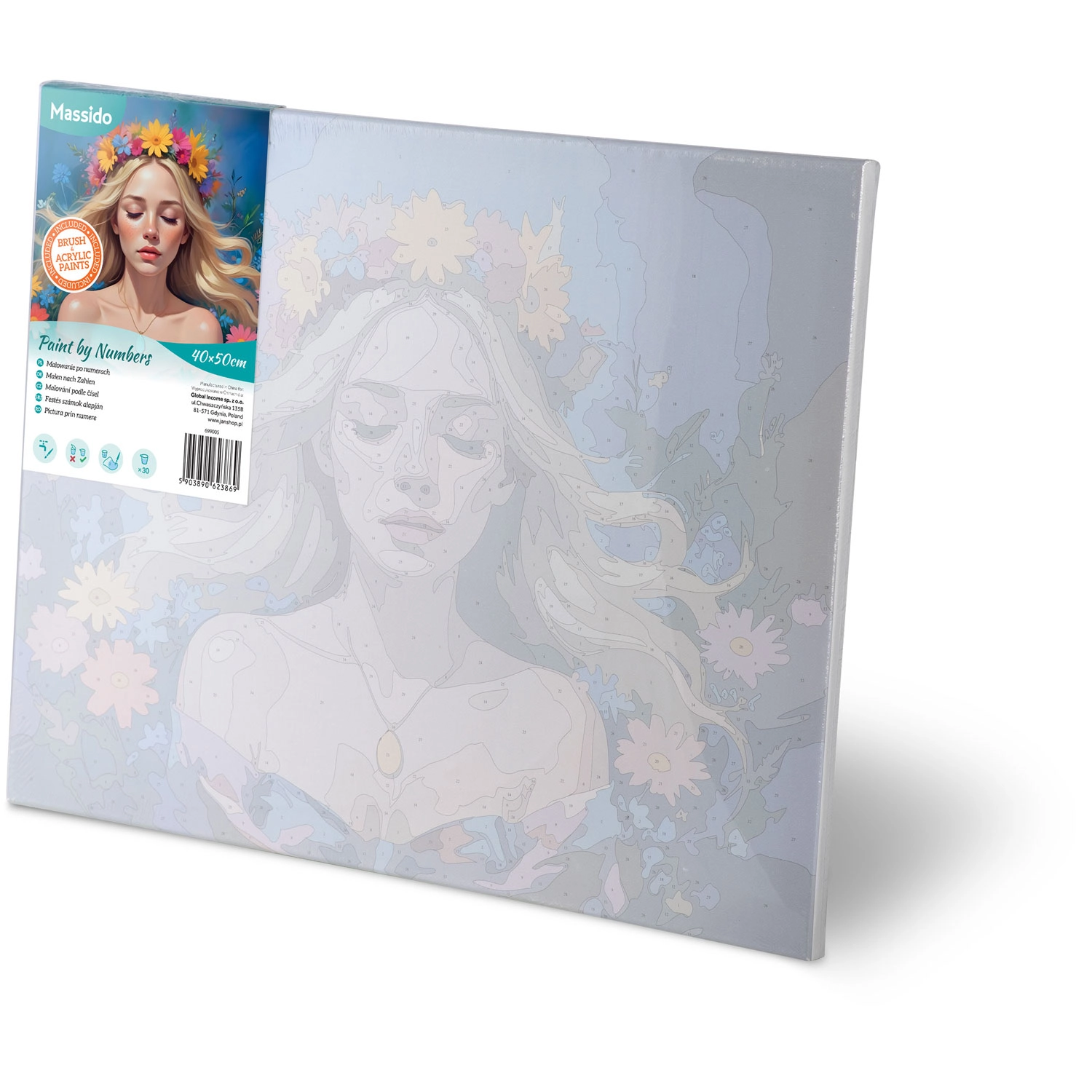 Voorbedrukt doek op frame, 30 acrylverven, 3 penselen en ophanghaakjes. Open de doos en begin met creëren zonder extra aankopen.